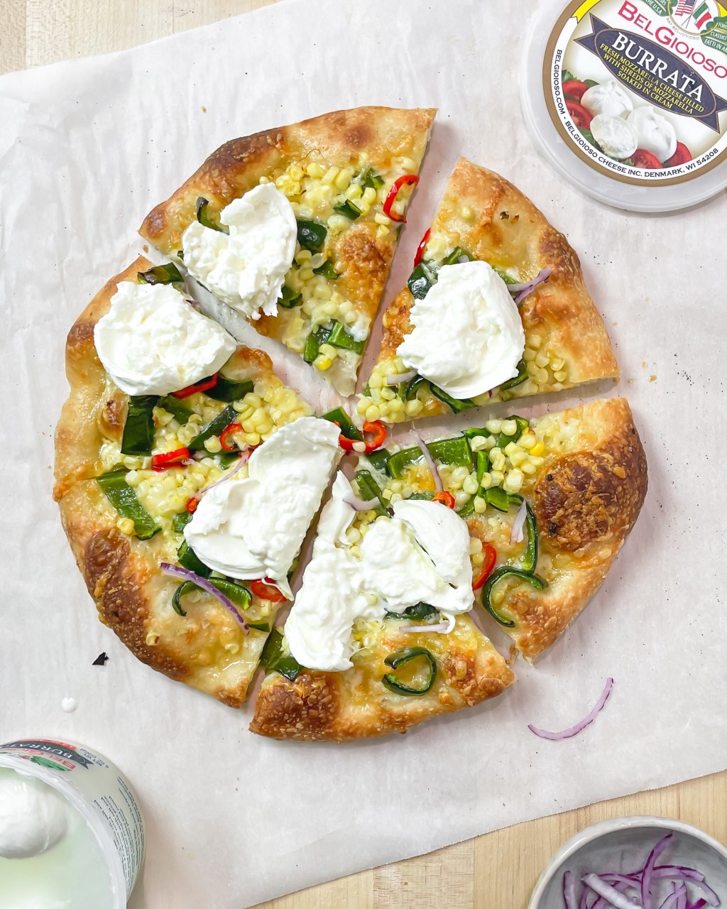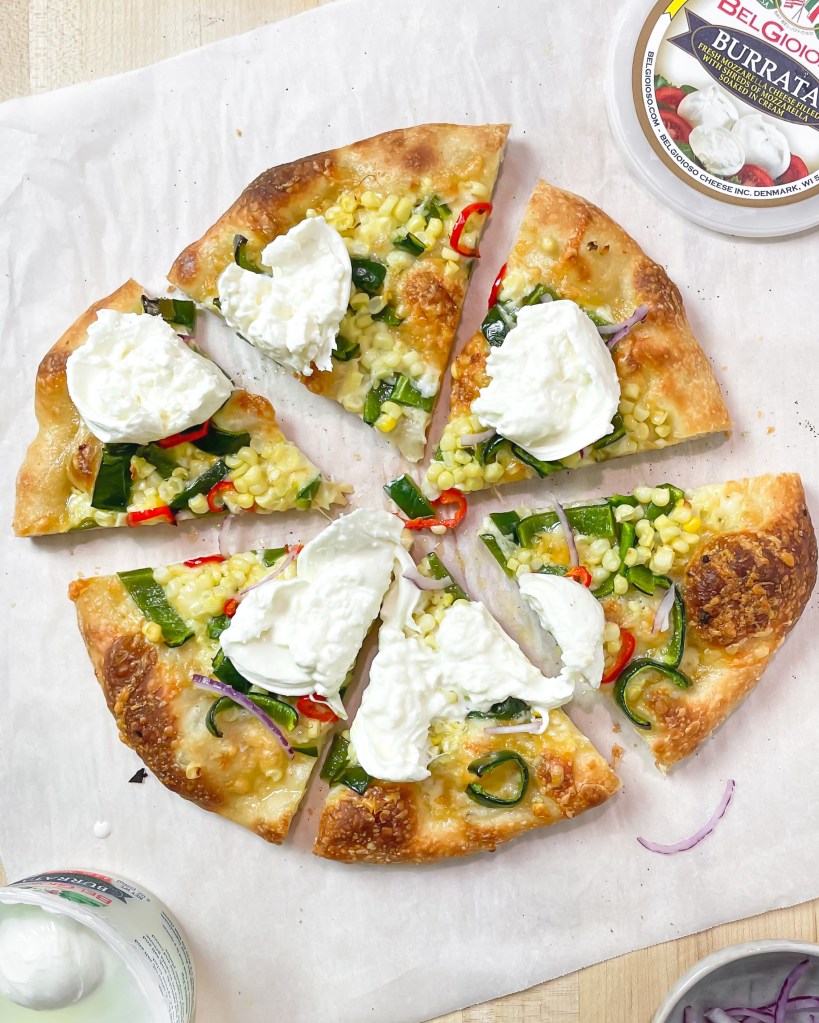 This Mexican-Italian mashup is a total winner! Crisp pizza dough with a garlicky cumin base topped with a little cheese, fresh corn, sliced poblano and spicy fresno pepper, baked until bubbley then finished with creamy burrata and bright red onion. Its savory, sweet, spicy, creamy, salty perfection! Its so good and ideal for summer!