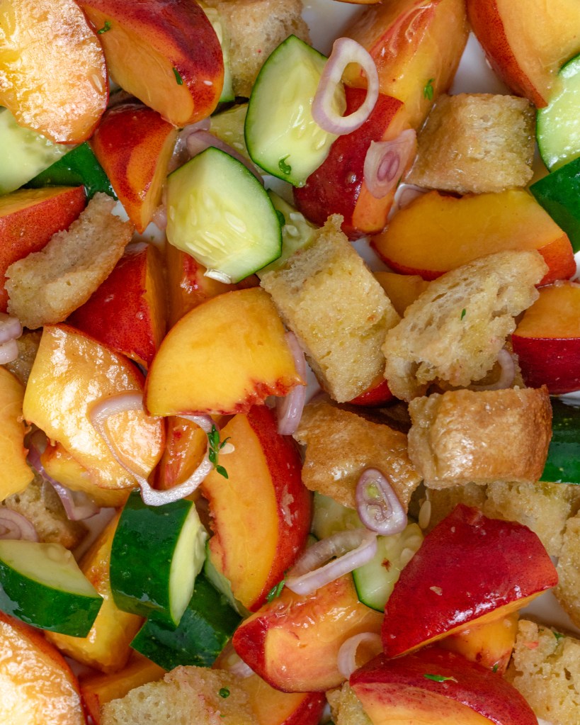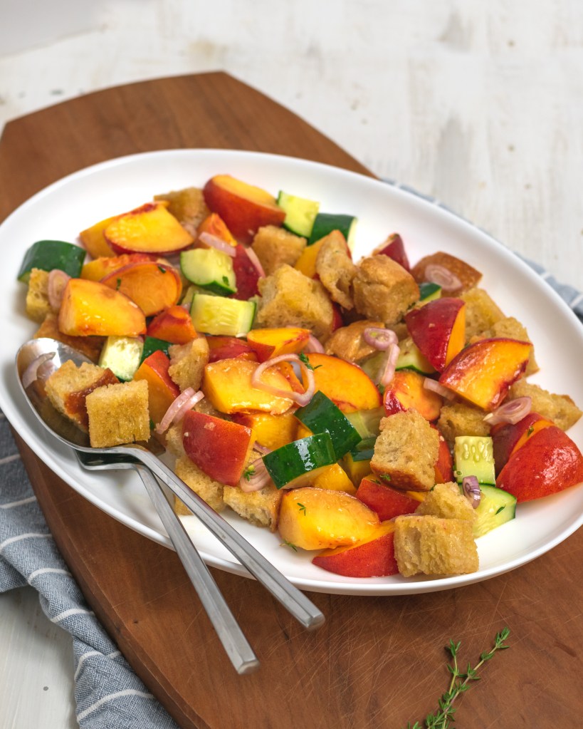 Fresh juicy peaches, hydrating cucumber and crispy croutons tossed in a light lemon-thyme dressing. Such a delicious and bright summer salad. You’re going to love it!