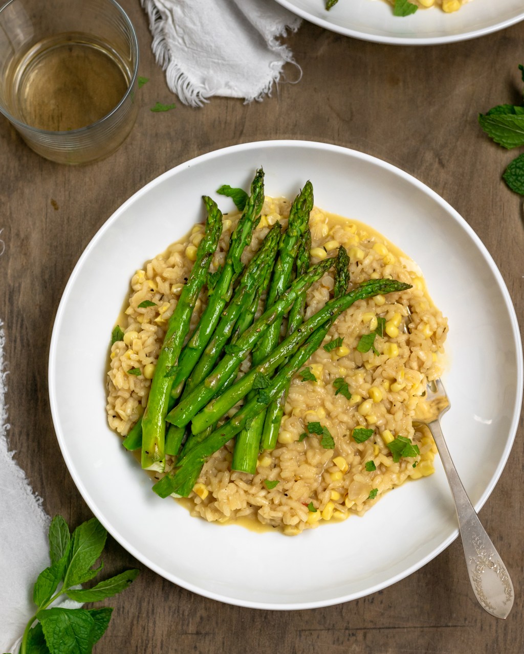 Creamy risotto with bursts of fresh corn topped with tender asparagus and finished with a sprinkling of mint. An elevated summertime dish that is so delicious and incredibly easy to make.