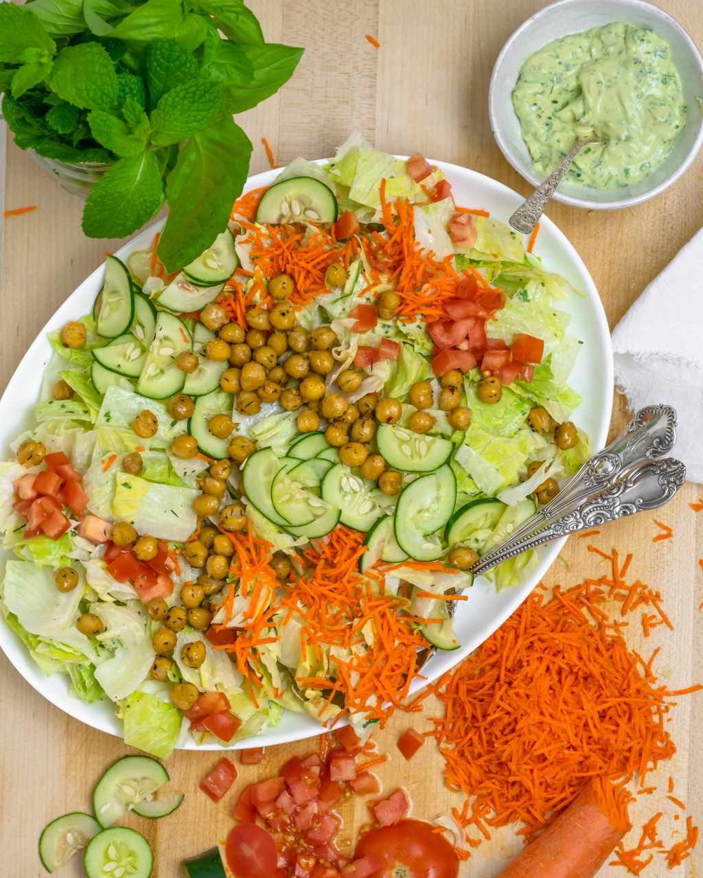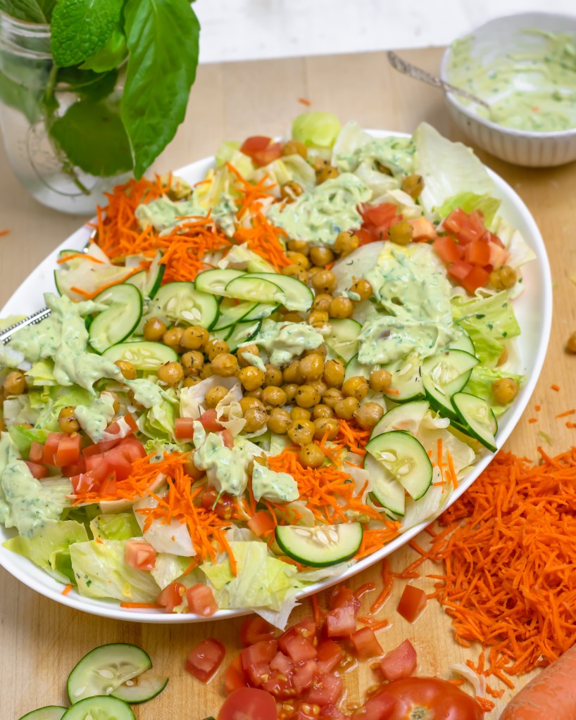 Crisp iceberg lettuce topped with fresh tomatoes, shredded carrot, sliced cucumber and crunchy roasted chickpeas tossed in a creamy herbed avocado-yogurt dressing. Flavorful, hydrating and delicious!