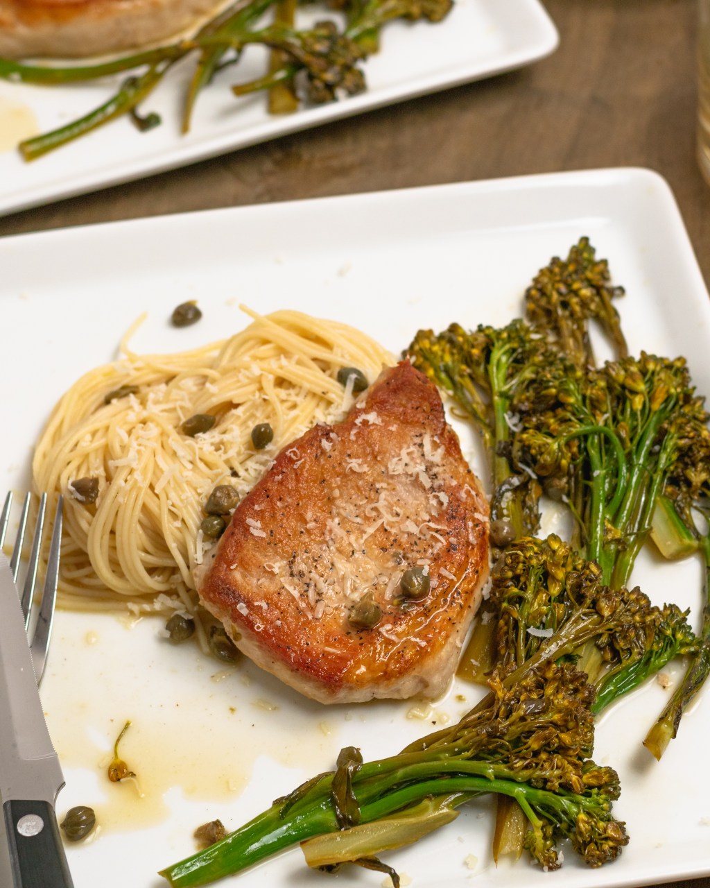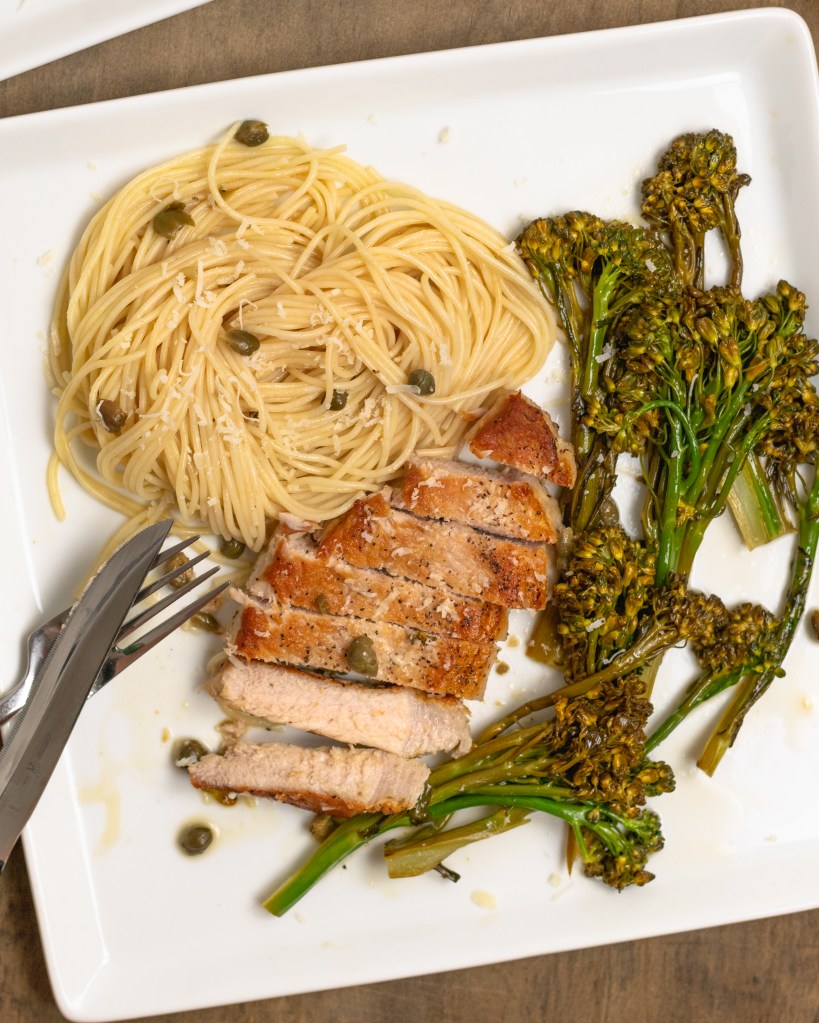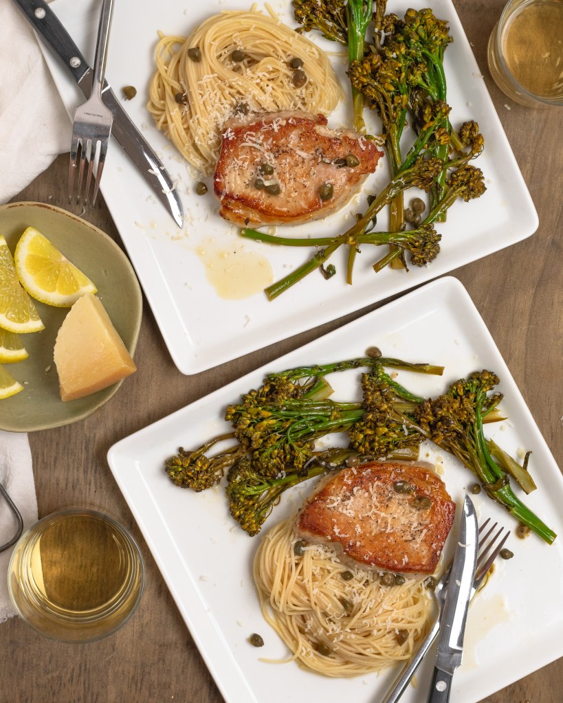 Tender seared pork chops and broccolini in a lemon caper pan sauce. Delicious and elevated but super easy to make!