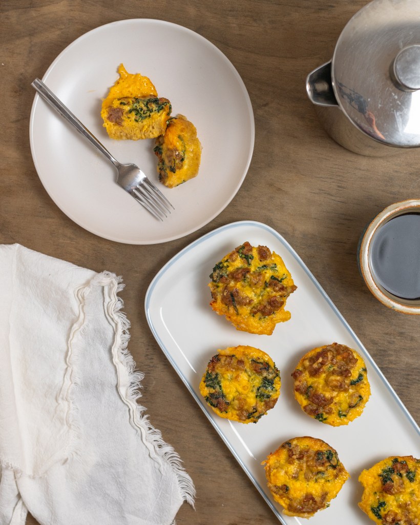 Inspired by our friends’ family favorite, these little eggs cups are incredibly flavorful! A quick prep the day before allows these eggs to absorb all the flavor of the sausage and start to soak into the bread. The next morning you throw them in the oven, melting the gooey cheese into the eggs and toasting up the bread on the bottom. Oh they are so perfect! Plus you can freeze them for one of the best on the go breakfasts around.
