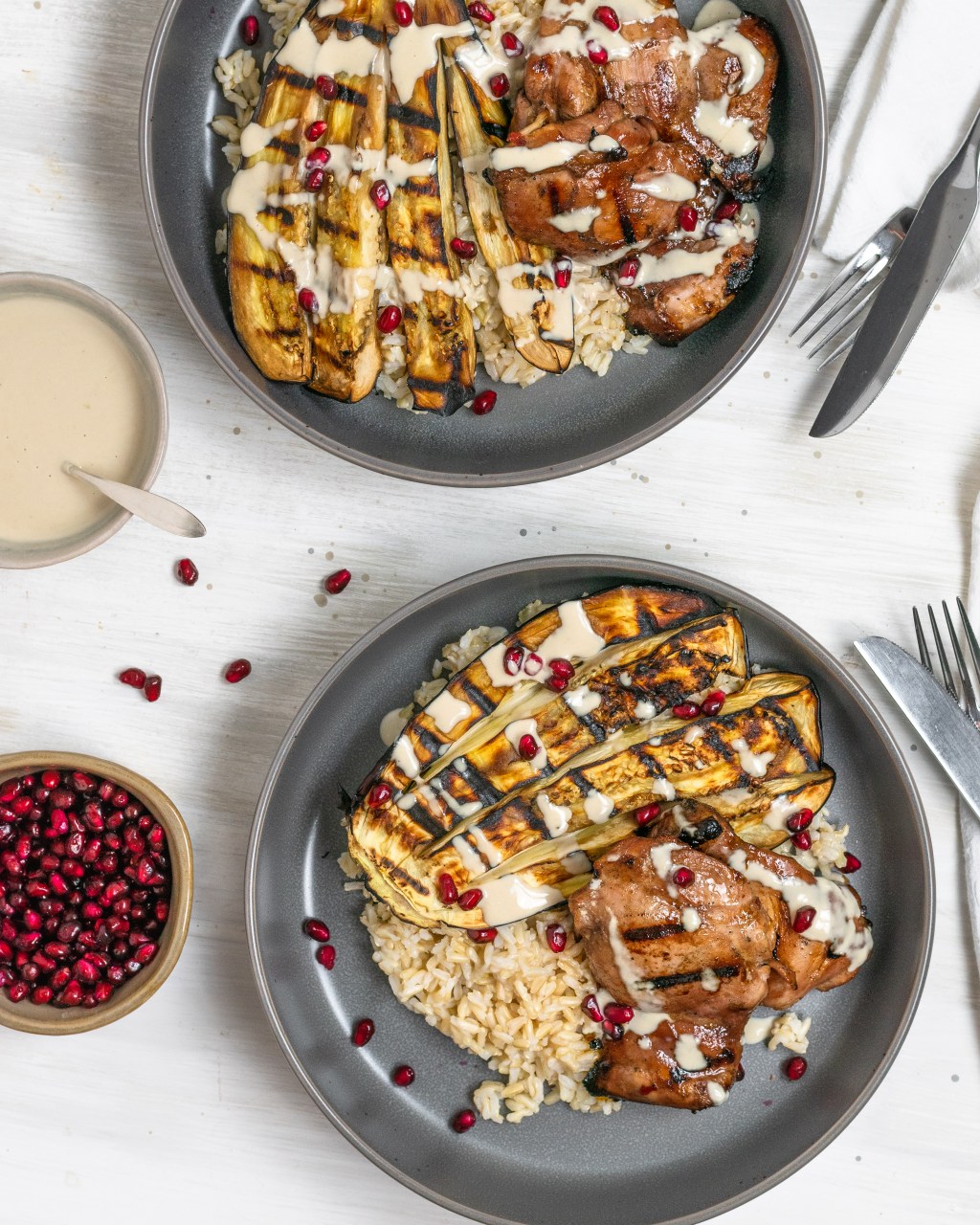 Spark up that grill, this chicken bowl is so delicious you wont wanna miss it! Chicken thighs marinated all day in a super flavorful spiced pomegranate sauce then grilled alongside some eggplant. Plated over rice (or your favorite grain) then drizzled with a yummy garlicky tahini sauce.