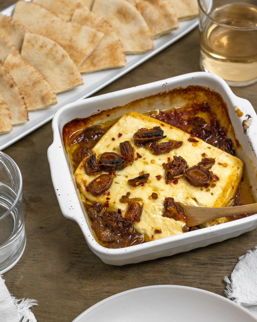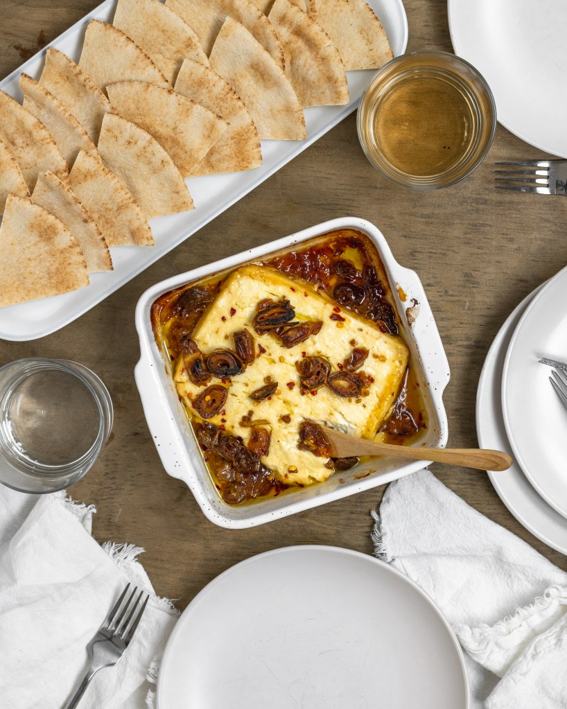 Dates tossed in a spicy lemon honey dressing, poured over a block of salty feta cheese then baked until the feta gets soft and creamy and the dressing bubbles up into a spicy sweet caramely sauce with soft gooey dates. A salty-sweet appetizer that will keep em coming back for more. Holy moly this is delicious!