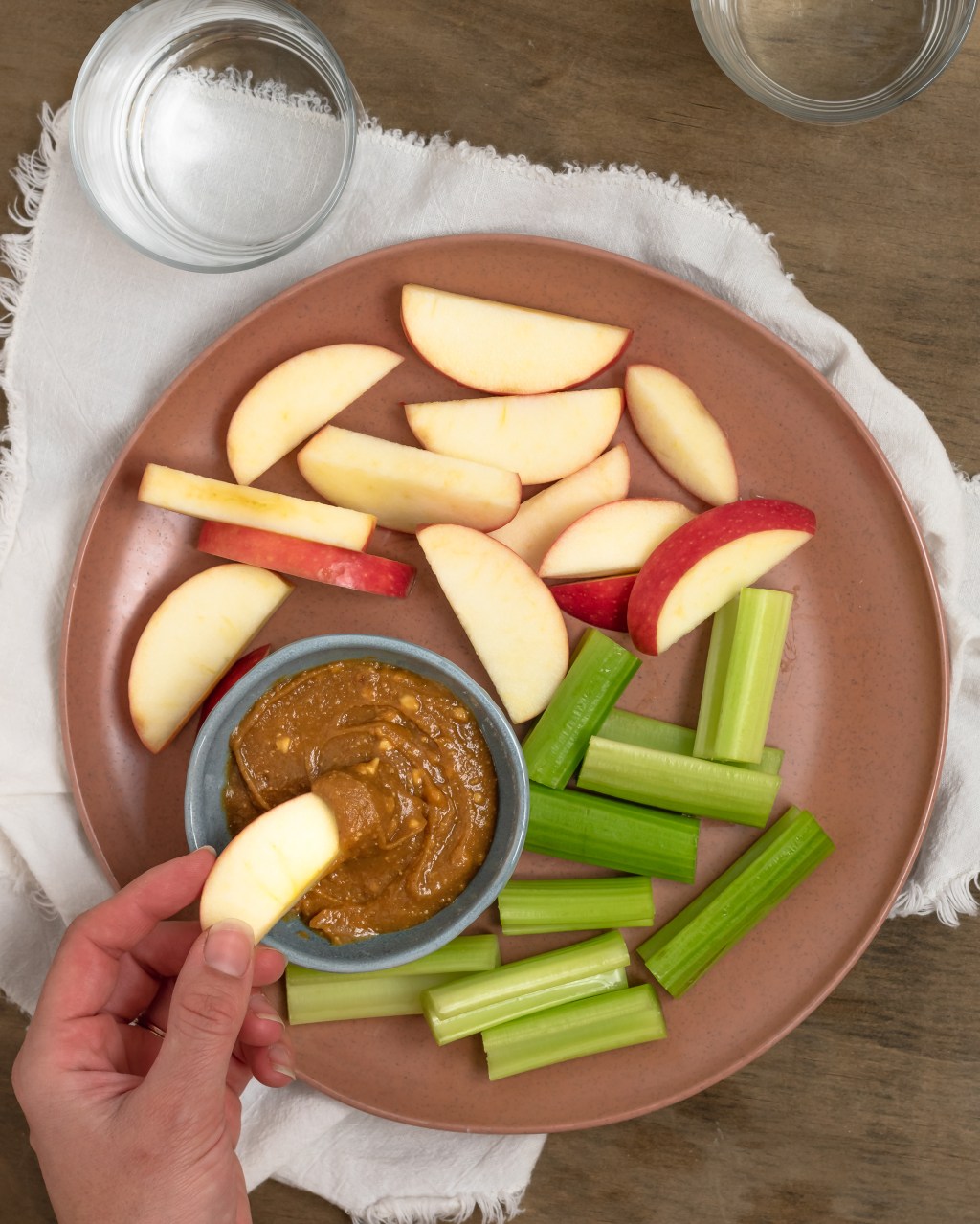 Its all in the name, salty peanut butter, sweet toasty maple syrup and savory, umami miso all stirred together then scooped up on a fresh crisp apple slice or celery stick. So unbelievably delicious. A total snack time game changer! You’re going to love it!
