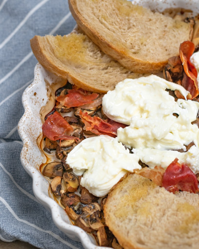 Preheat oven to 425°F. In a 8×8 baking dish, add mushrooms, shallot, garlic, thyme, salt, red pepper flakes and wine. Give it a stir then bake for 20 minutes. Distribute the prosciutto pieces randomly over the top and bake for another 20 minutes. While its still hot, tear the burrata over the top and serve immediately with toast.