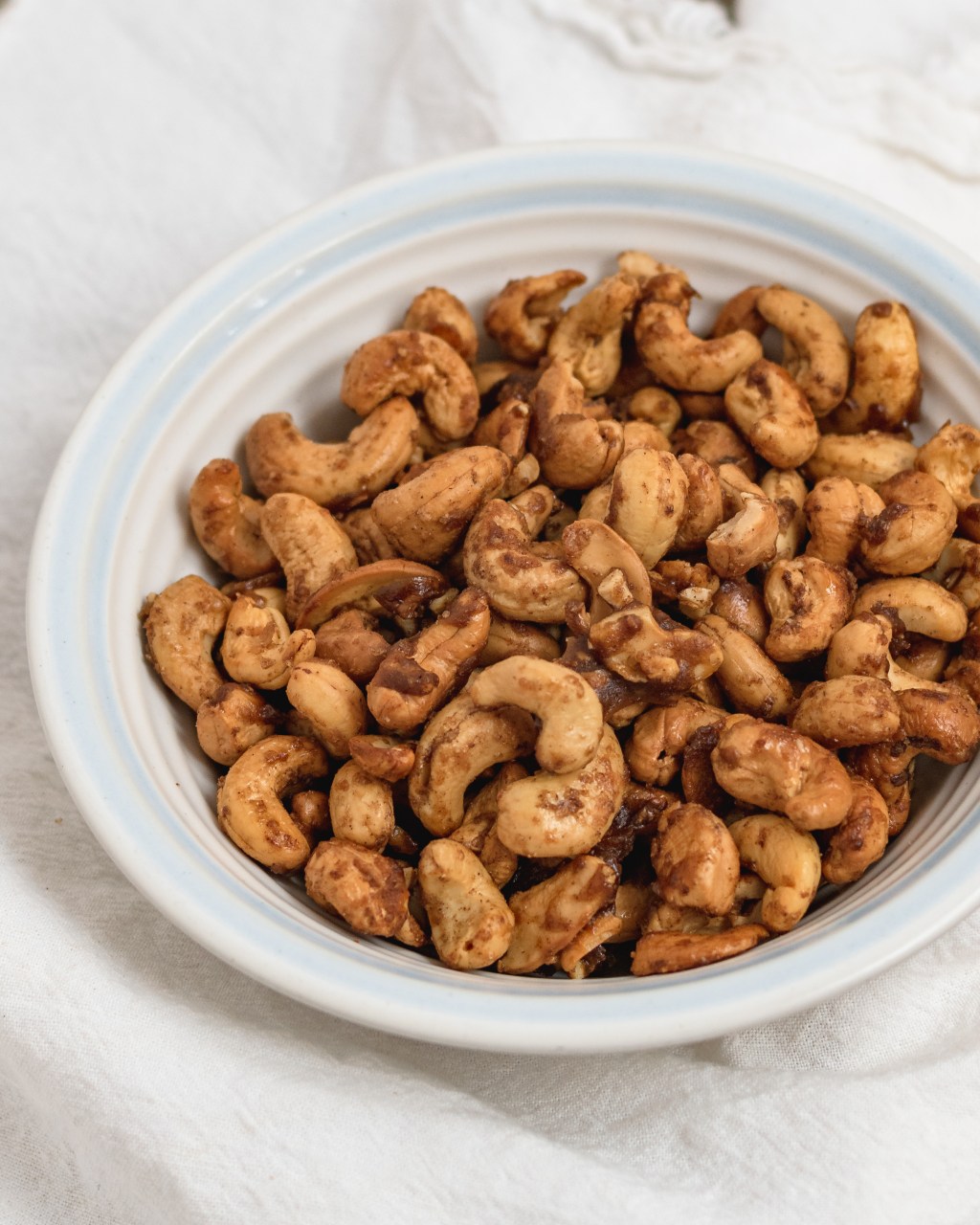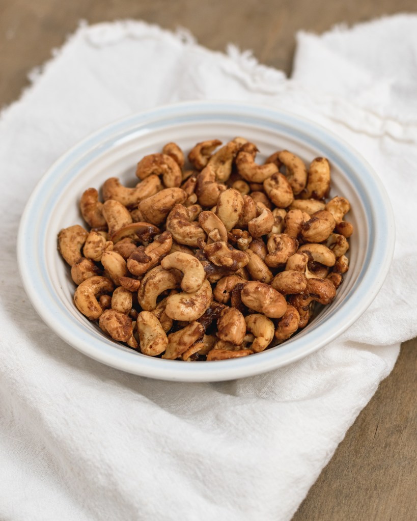 Crispy, mapley cashews with a touch of cinnamon. Simple crunchy and so delicious. Just 5 ingredients you probably already have and 15 minutes in the oven. A perfect Fall snack that anyone can make!