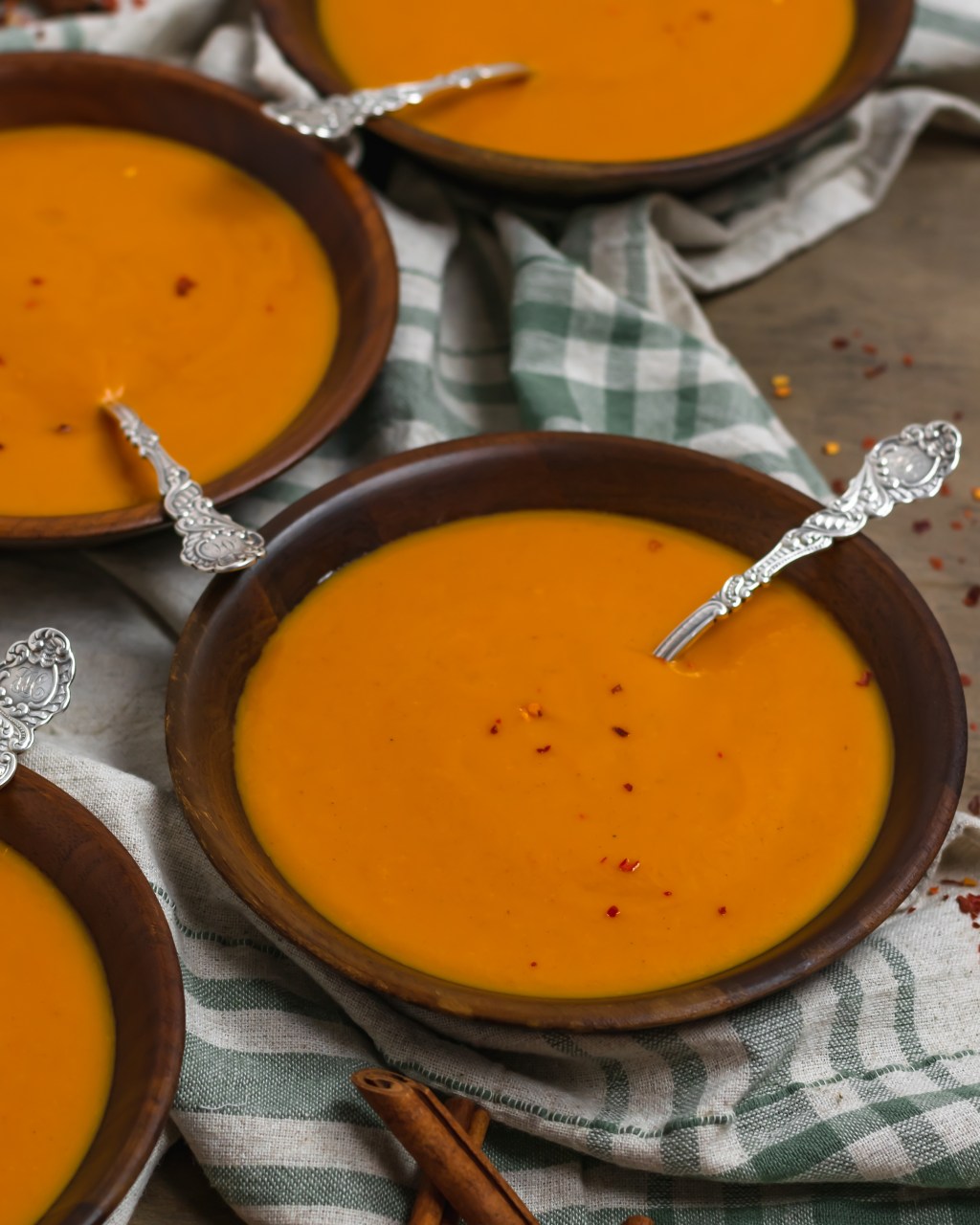 Fresh tomatoes and butternut squash are tossed in coriander, garlic and cinnamon then roasted to perfection and blended into a velvety smooth, thick and creamy soup. Warming, cozy and so full of flavor. So freaking delicious!