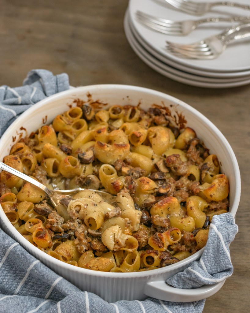 Luscious fontina cheese sauce with bits of sausage and mushroom and lots of sage, thyme and garlic, wrapped around your favorite pasta then baked just enough to crisp the edges. One of the fanciest mac and cheeses around. So delicious, easy to make and full of Fall flavor!