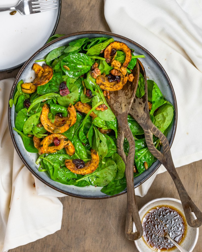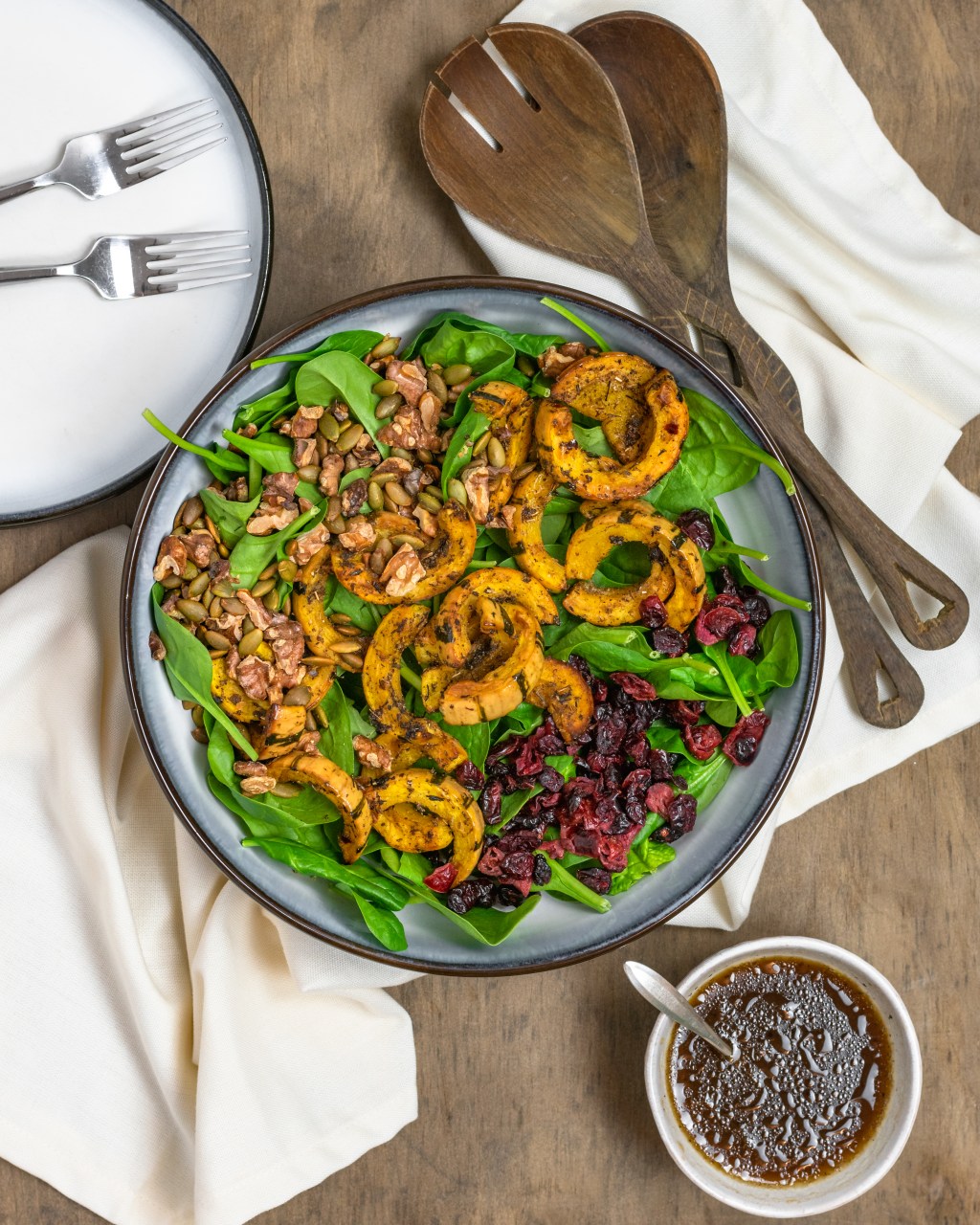 Delicate squash sliced up and spiced up then roasted until tender atop a bed of spinach with tangy dried cranberries and toasty walnuts and pepitas. This delicious Fall salad is perfect on the side or top it with your favorite protein for an easy dinner any night of the week.