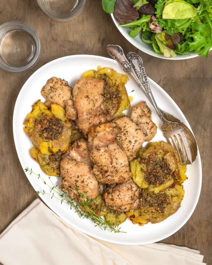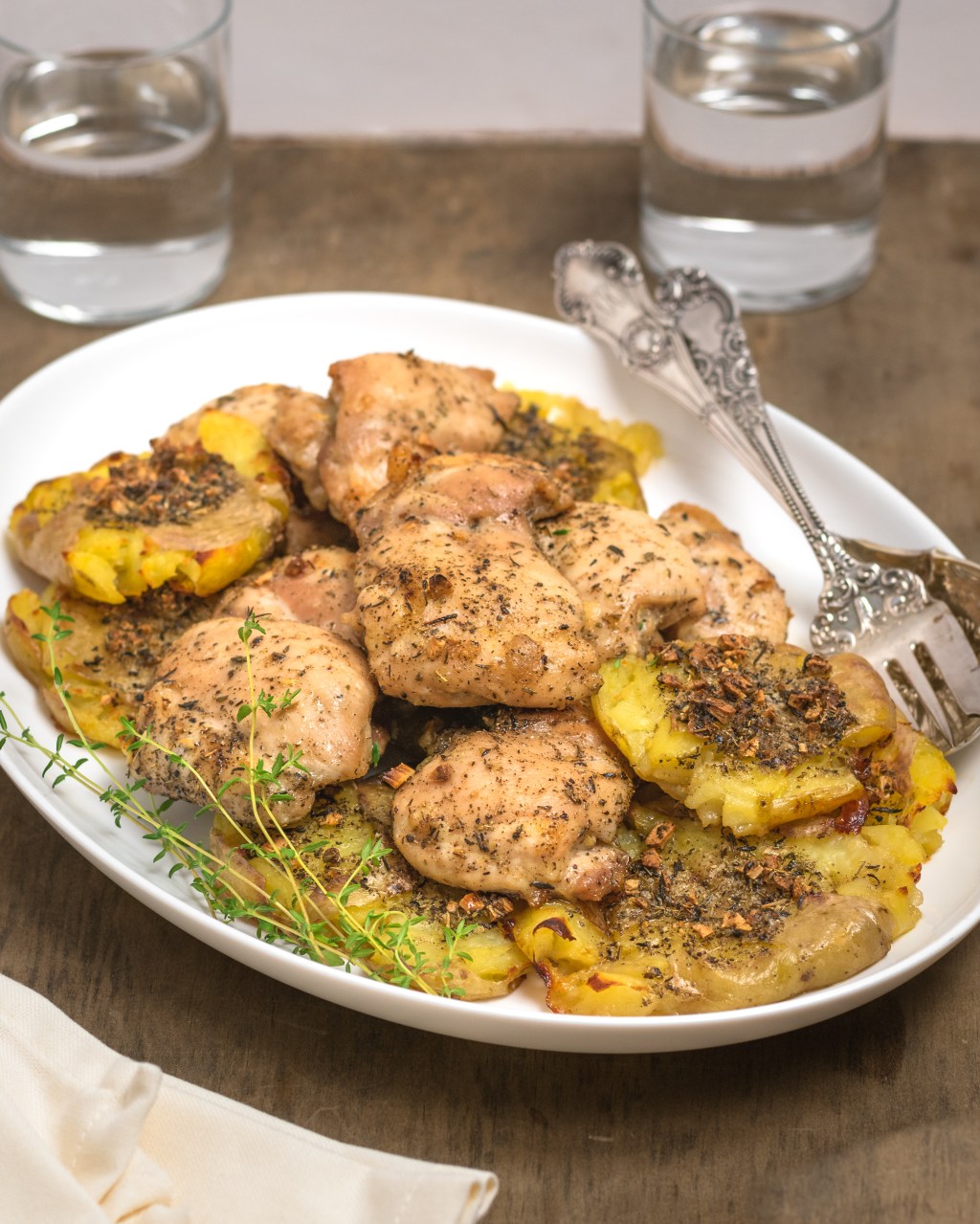 In a large bowl, stir together olive oil, garlic, salt, thyme, pepper and sage. Dump the potatoes on a large parchment-lined baking sheet. Using the bottom of a large cup, smash each potato down to about 1/2″. Spread them out over the baking sheet then spoon about 1 teaspoon of the olive oil mixture on top of each potato, spreading it out a little. Add the chicken to the remaining olive oil and toss to coat then place each thigh on the baking sheet with the potatoes. Roast for 30-40 minutes, until the potatoes get crispy and the chicken is cooked through.