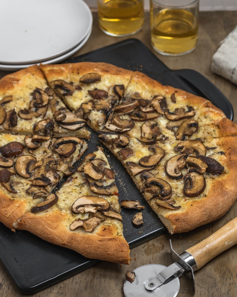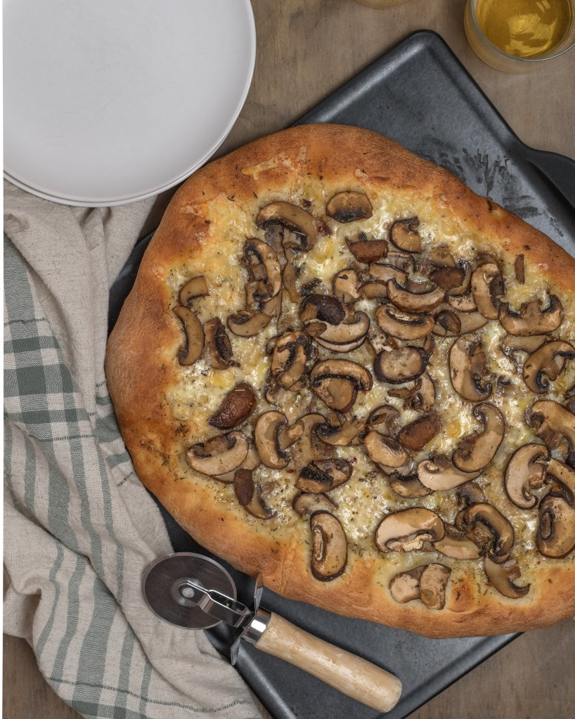 A super simple olive oil base pizza heavy on the sage and garlic and loaded with mushrooms and gooey cheese. Easy, delicious and perfect for Fall!