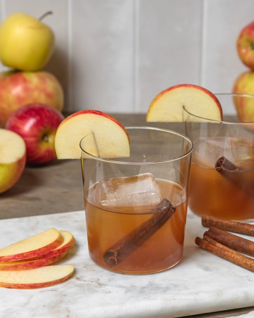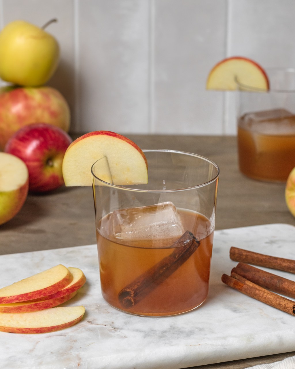 Add ice to a rocks glass. Pour in bourbon, apple cider syrup and bitters then stir together. Garnish with a cinnamon stick and apple slice