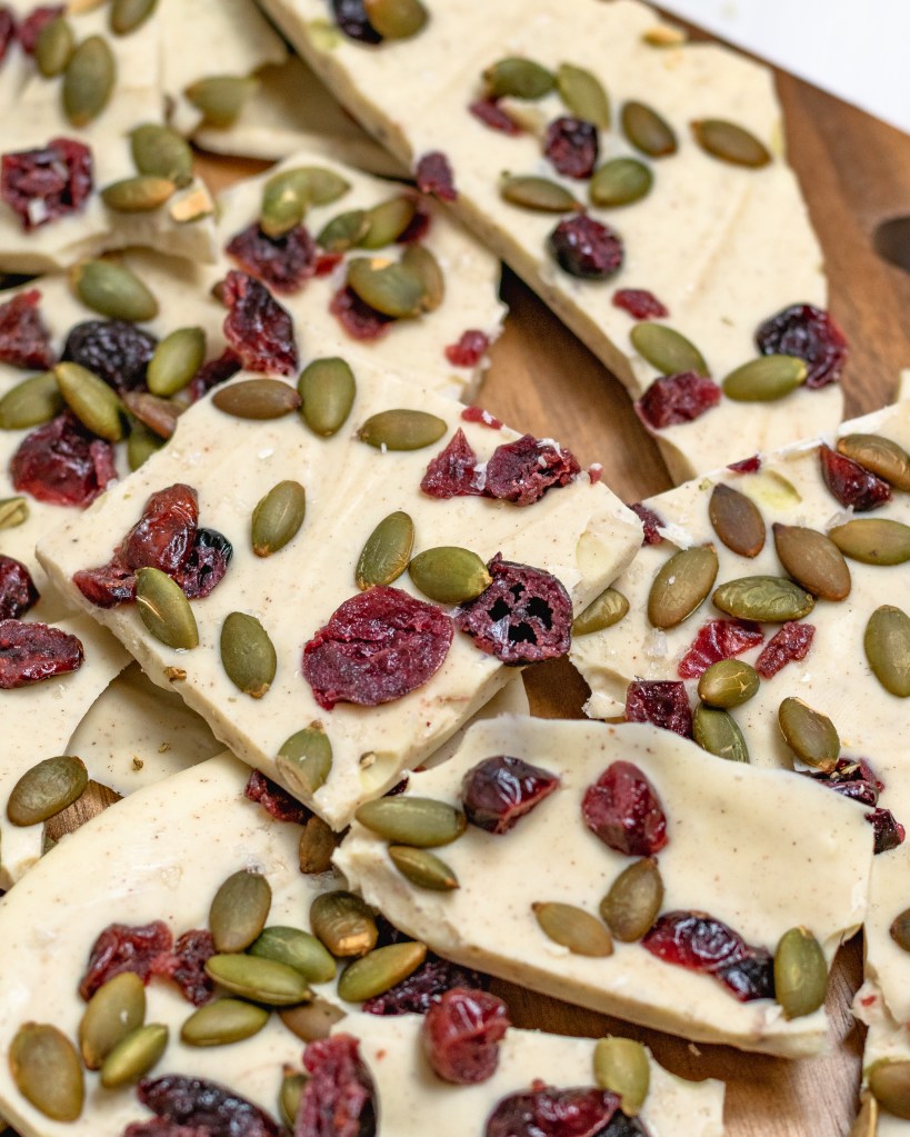 White chocolate spiced with cinnamon and nutmeg, topped with tangy chewy cranberries and toasty crunchy pepitas. A simple holiday treat.