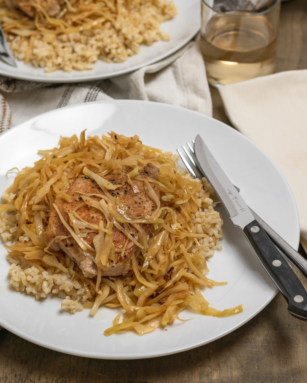 Quick seared pork chops with a bunch of cabbage that’s cooked down with a little heat, lots of garlic and some apple cider vinegar. These pork chops are incredibly flavorful, very quick to make and super budget friendly. You’re gonna love em!