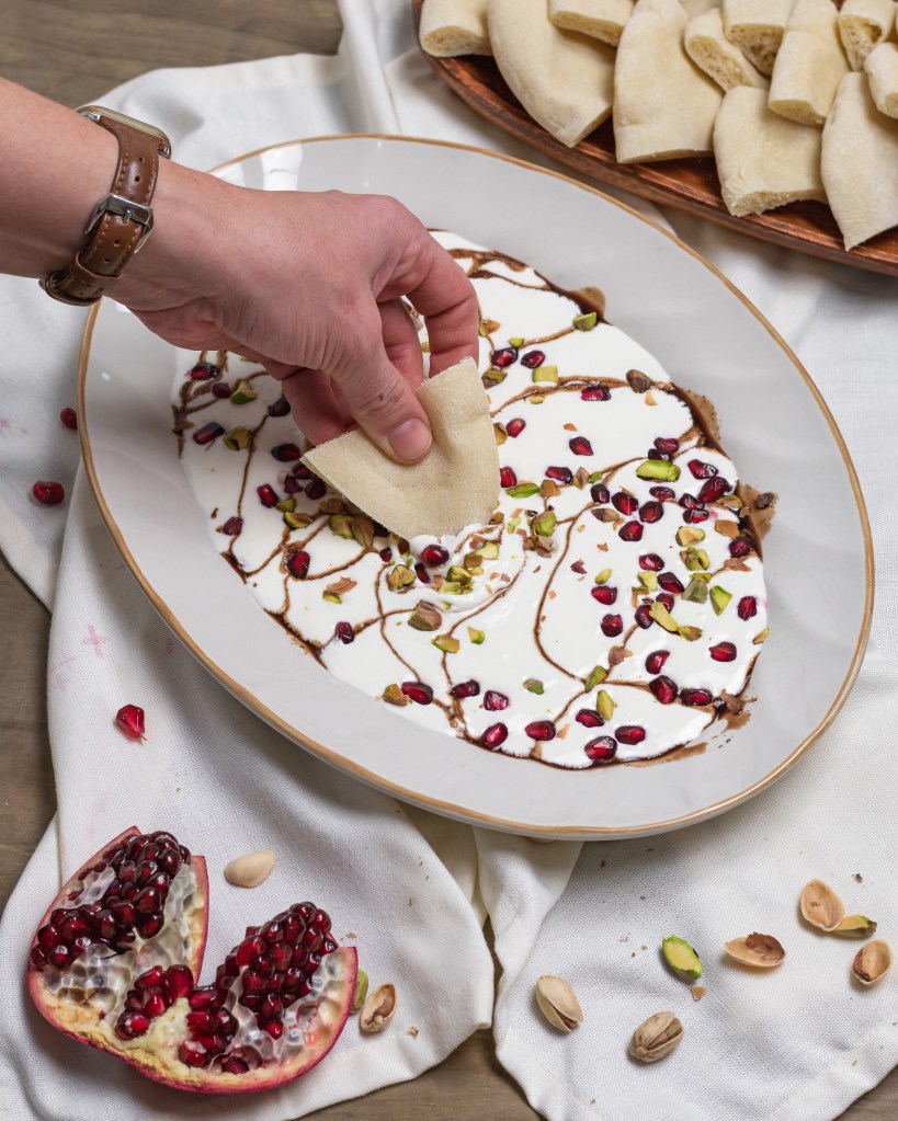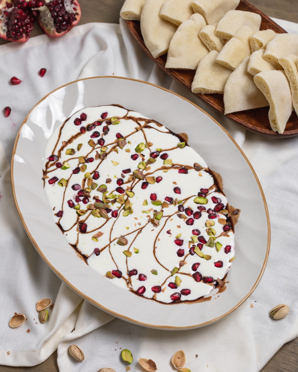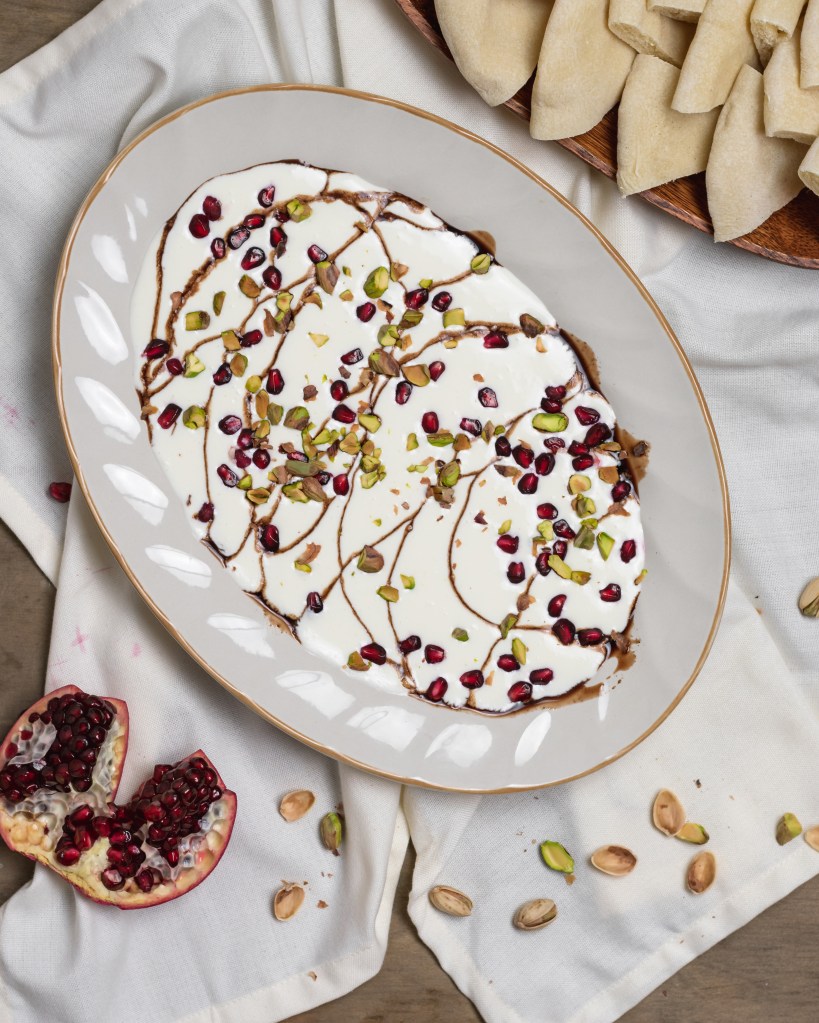 Salty feta whipped into smooth and creamy dip drizzled with a spiced pomegranate reduction and sprinkled with pistachios and pomegranate seeds. A delicious flavor combination that everyone will love!