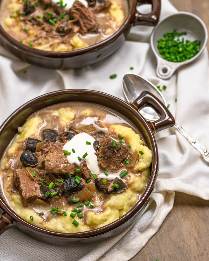 Tender beef slow cooked all day with mushrooms in a flavorful dijon broth, finished off by swirling some sour cream in to make it tangy and creamy. So delicious and easy to make.
