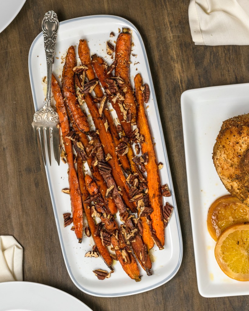 Carrots roasted with ginger and cardamom until just tender then orange juice and balsamic are poured in at the last minute to make a flavorful zesty sauce. Finished off with some crunchy toasted pecans to balance it all out. Delicious, elegant and easy.