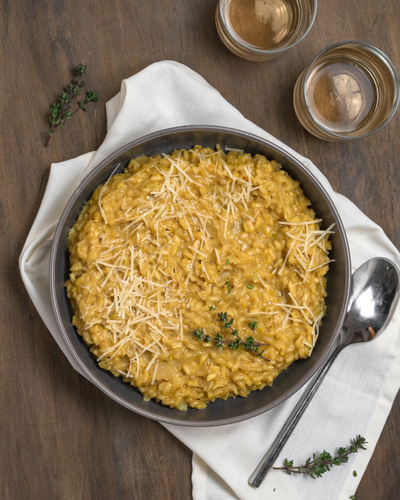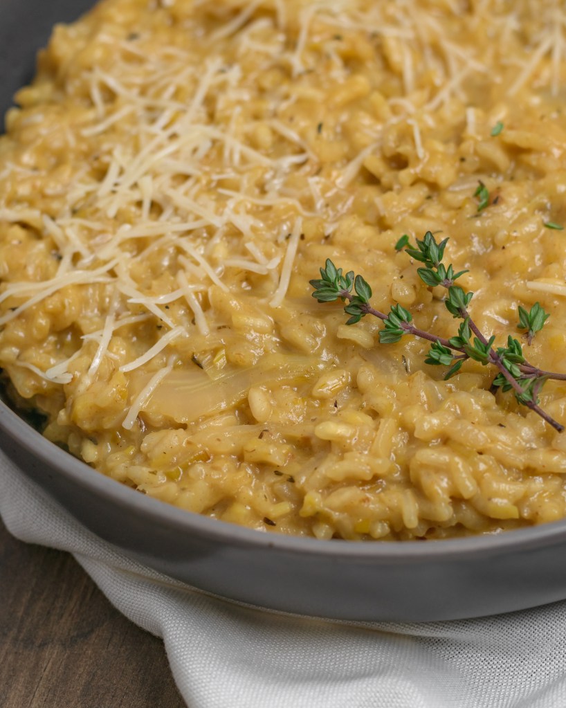 Classic risotto started off with thinly sliced leek and fennel caramelized with thyme, deglazed with white wine and simmered with rich broth, finished with a little butter and parmesan. This dish is so creamy, flavorful and elegant, yet simple and easy to make.