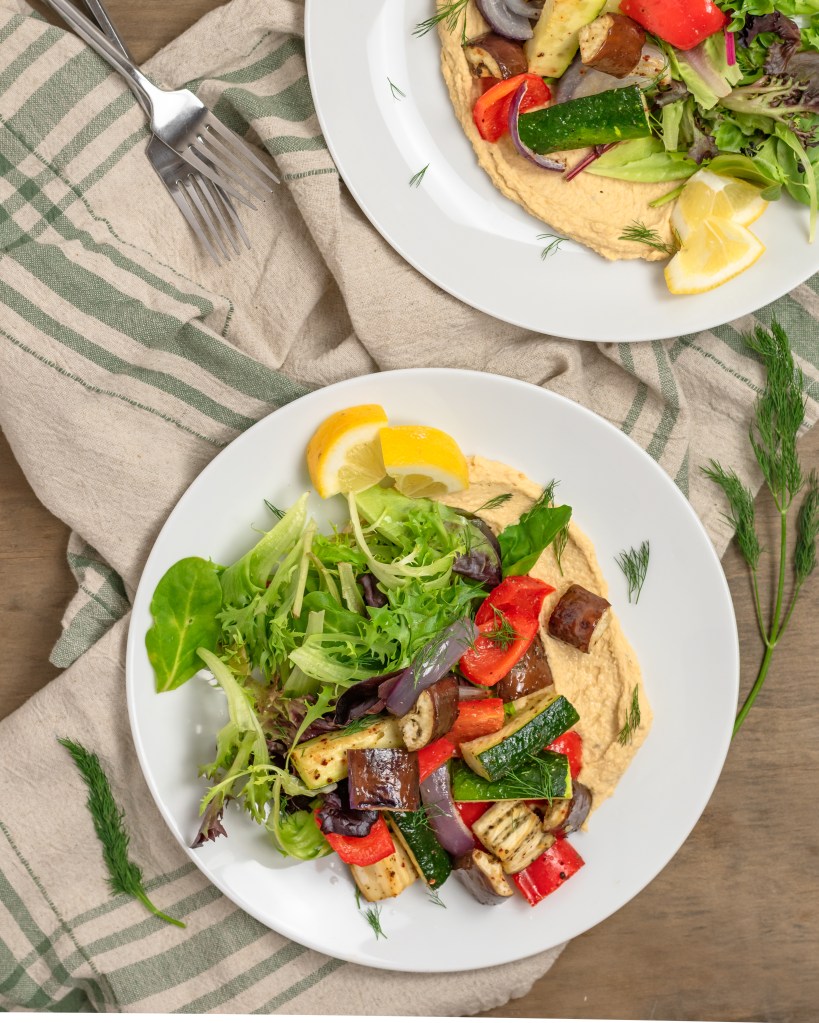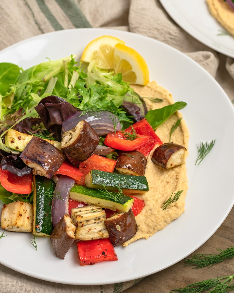 Eggplant, zucchini, bell pepper and red onion seasoned up with garlic, oregano and aleppo pepper and roasted til just tender and served over a big smear of hummus and fresh greens with a squeeze of lemon and pinch of dill. Flavorful, healthy and delicious. Love it!