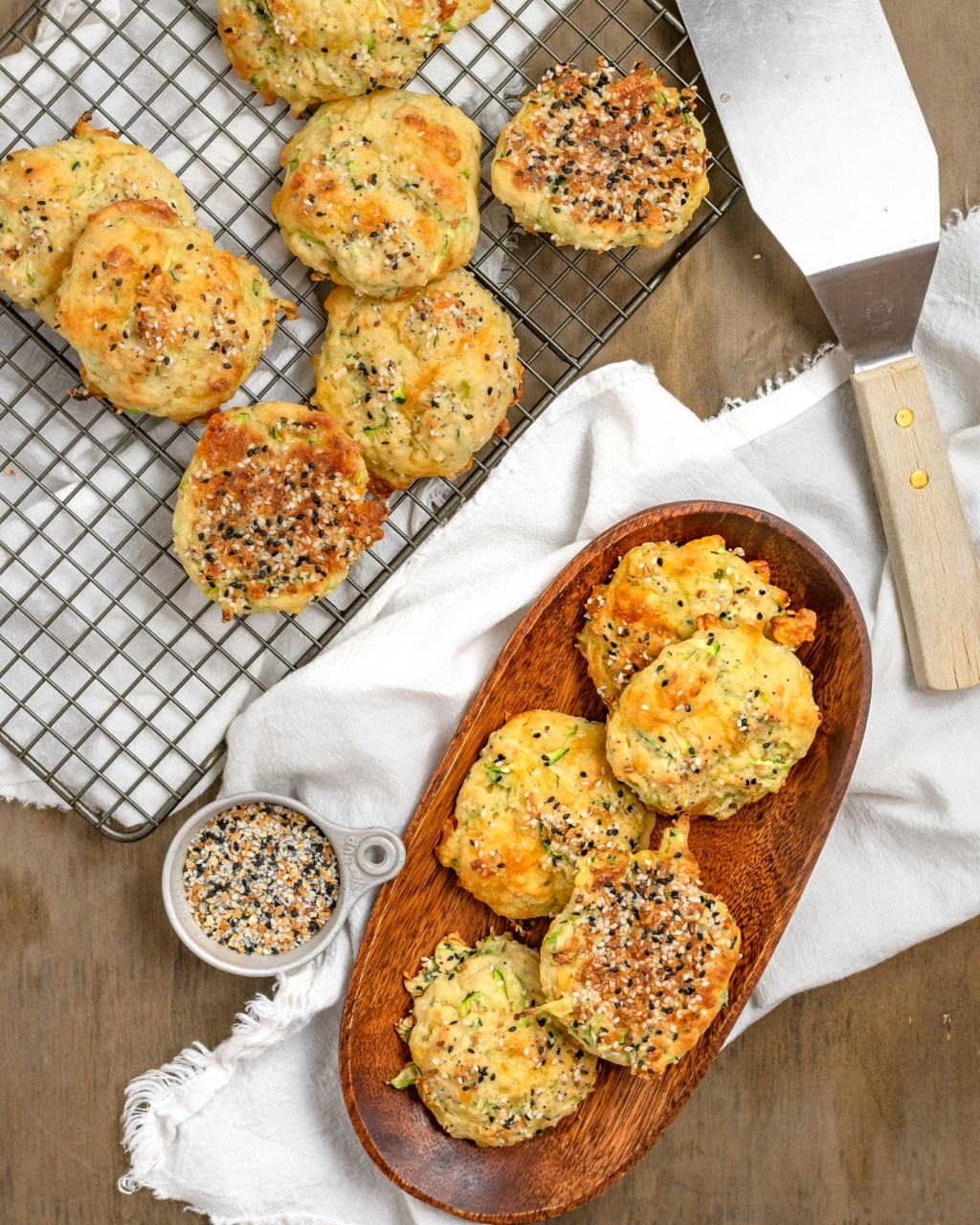 Fluffy, cheesy drop biscuits loaded with shredded zucchini and encrusted with everything bagel seasoning. So dang delicious. So dang easy to make.