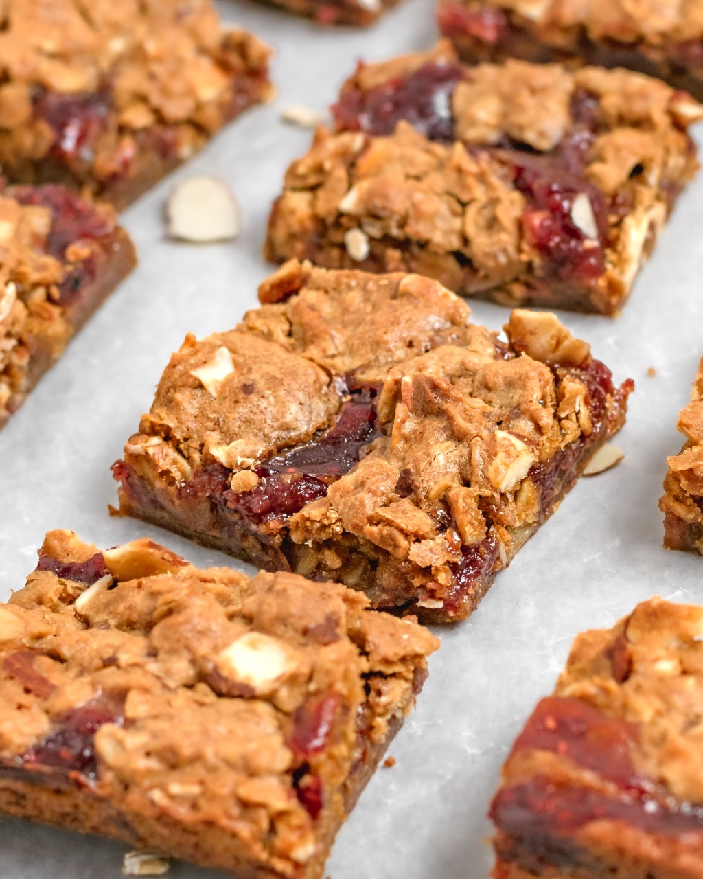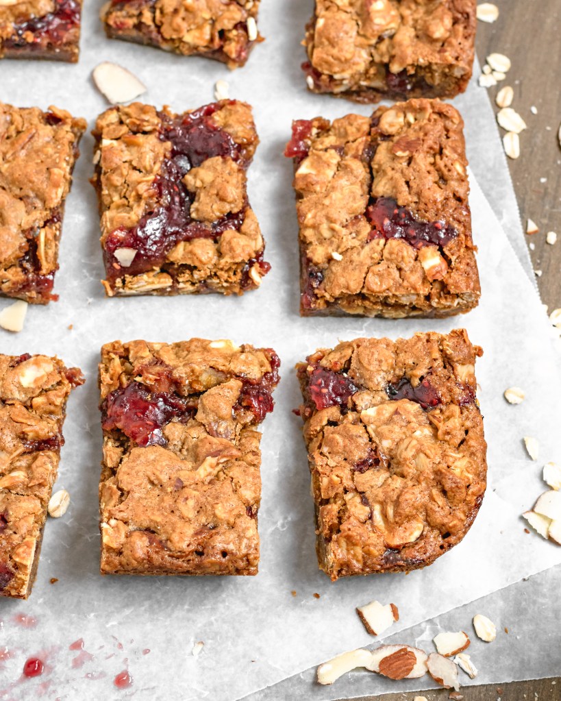 Preheat oven to 350°F. Using a whisk, stir together butter and brown sugar in a large bowl, add the egg and vanilla, stir to combine. Pour in flour, baking powder and salt and stir it in. Dump about 2/3 of the batter in a well greased, parchment-lined 8×8/9×9 baking dish. Evenly spread it out then pour the jam over and spread that out too (I like to microwave the jam for about 15-30 seconds so its easier to work with). Add the oats and almonds to the remaining batter and fold them in. Grab clumps of the batter and sprinkle it over the top, making sure to leave pockets of jam showing through. Bake for 35-40 minutes, allow to cool before removing it from the pan and slicing it up.