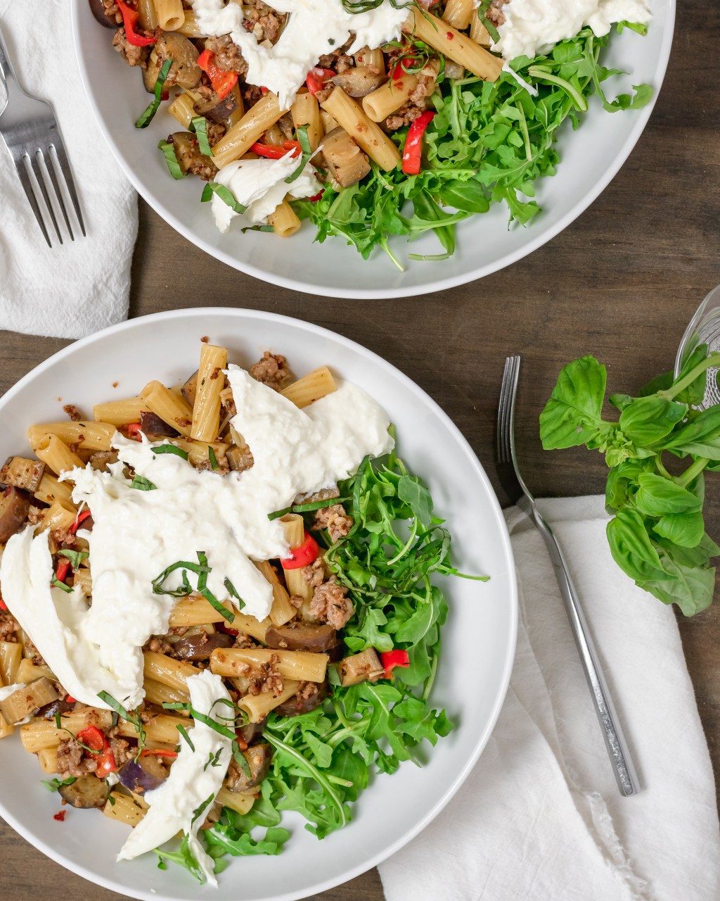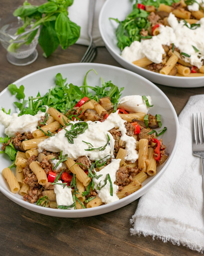 A simple, silky smooth, garlicky-herb pasta with crispy hot sausage, eggplant and bell pepper. Topped with torn burrata and finished with fresh basil. A quick and easy weeknight dinner that is absolutely delicious! You’re going to love it!