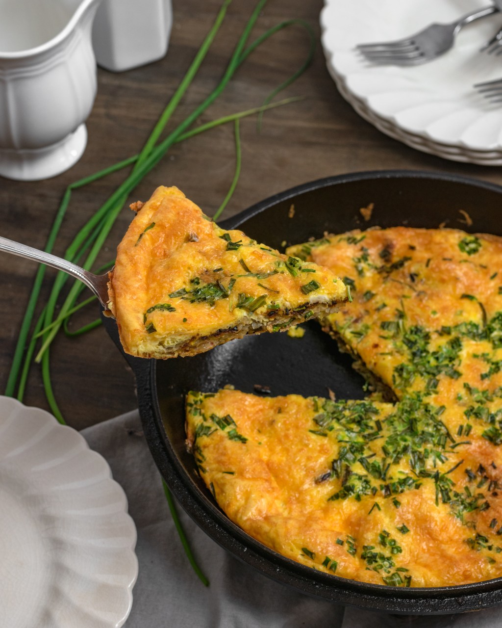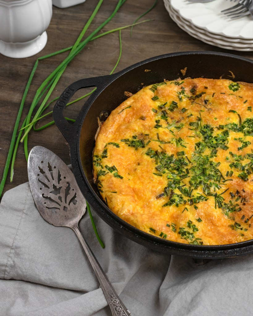 Whipped eggs poured over a crispy potato leek pancake topped with lots of cheddar cheese and chives then baked to perfection. The best for a crowd or meal prepping for the week. So delicious!
