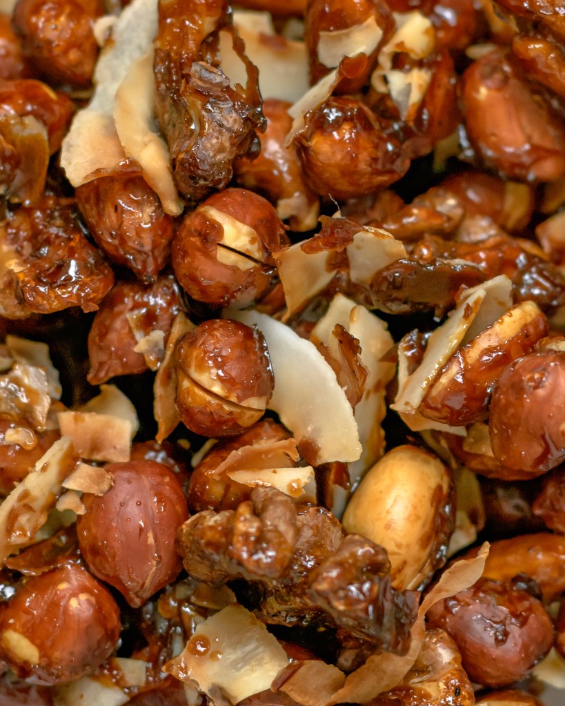 Coconut flakes, peanuts and walnuts roasted up in an oh-so-flavorful vanilla honey that caramelizes just enough to give this delicious snack just a touch of vanilla-y sweetness. Whether you’re hitting the trail or just need a healthy snack at home, this nut mix is the BEST.