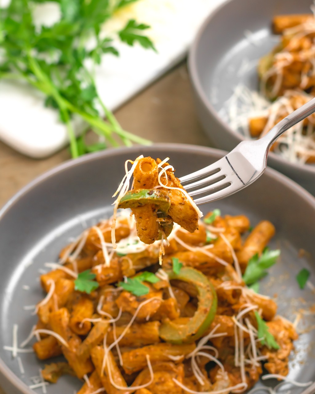 Bring a large skillet to medium-med-high heat. Pour in 2T olive oil then the chicken along with half of the seasoning mix. Cook chicken for 5-7 minutes until cooked through, then remove to a bowl or plate and set aside. Dump in the onion, bell pepper, celery, the rest of the seasoning and remaining olive oil. Cook for 1-2 minutes then deglaze with the white wine (pour it in a scrape the brown goodness off the bottom), cook for another 3-4 minutes until the veg is softened and most of the liquid has cooked down. Turn off the heat then pour in the pasta water, pasta and cream cheese then sprinkle the parm on top. Stir until everything is combined. Top with a little extra parm and parsley then serve.