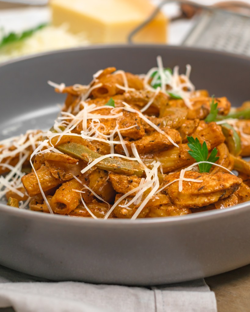 Flavorful, spicy and so much fun! Chicken, onions, celery and green bell peppers heavily seasoned with a delicious cajun spice blend, deglazed with a little white wine then tossed with pasta and cheese. So freaking good. You’re going to love it.