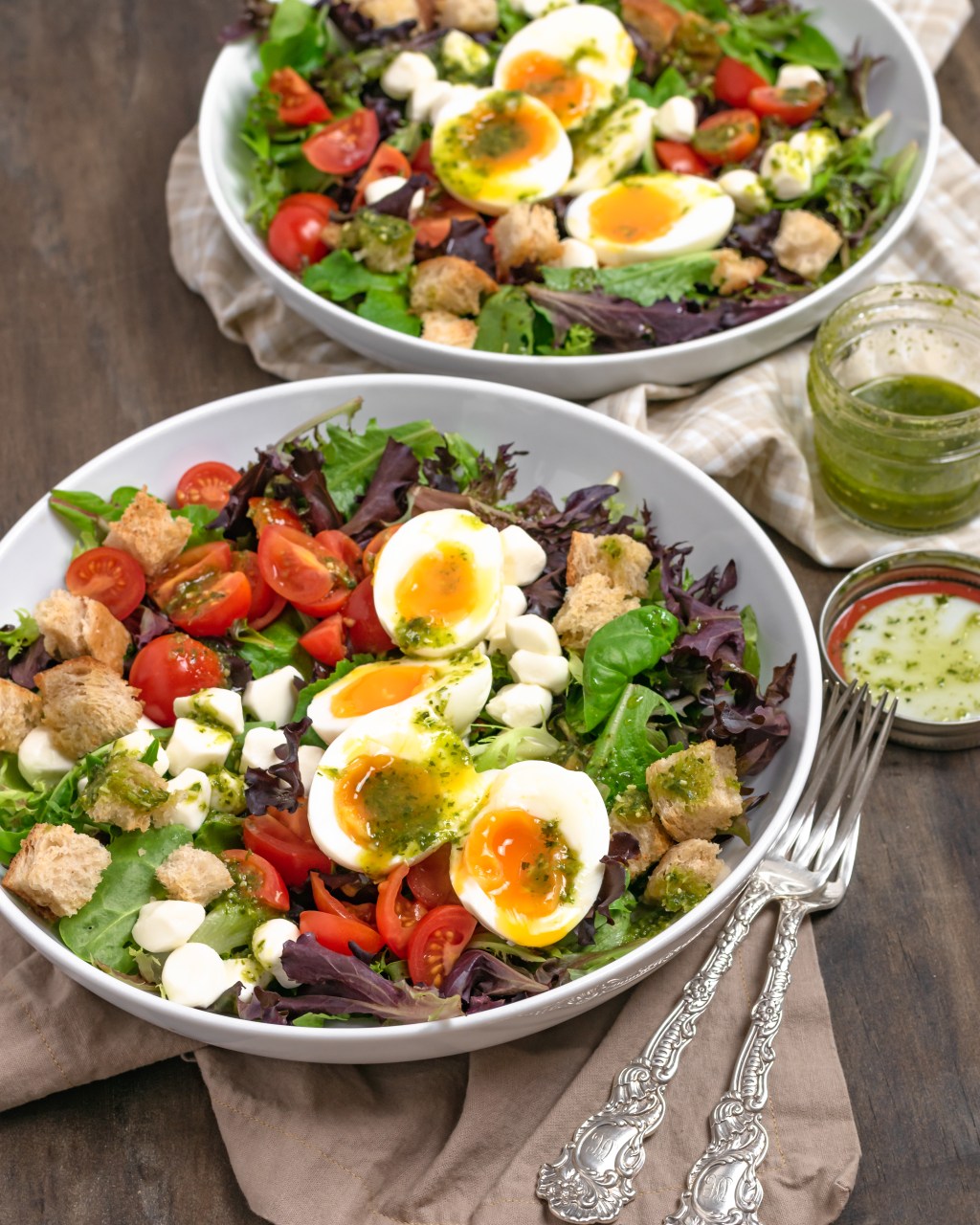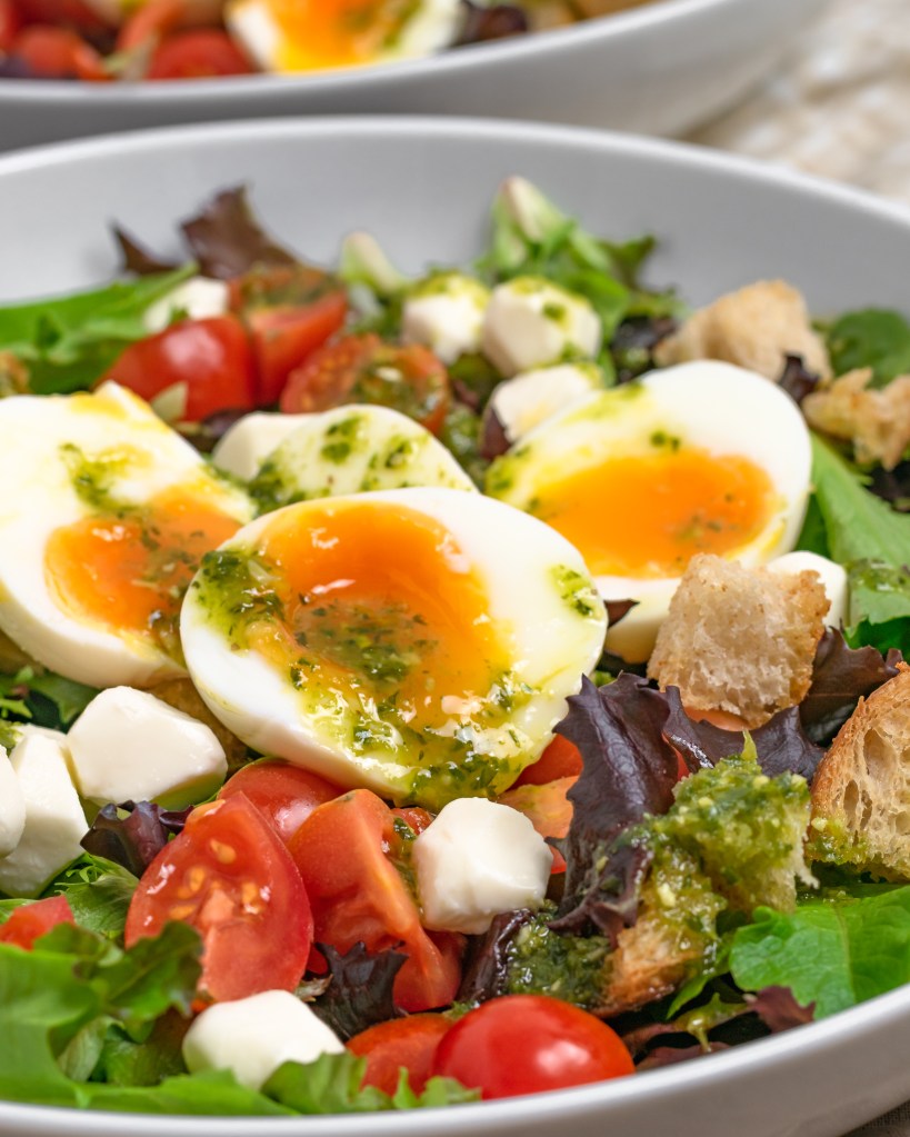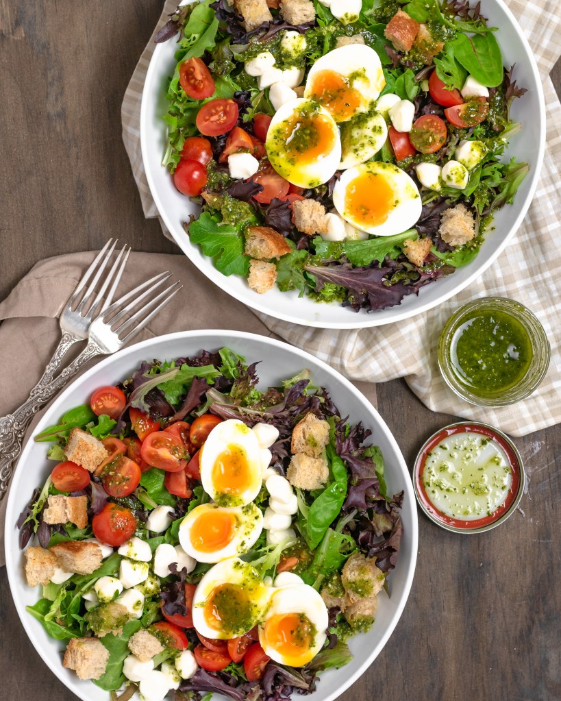 Quick, fresh, healthy and so darn tasty! Lots of crisp greens topped with juicy tomatoes, creamy mozzarella, jammy eggs and crunchy garlic croutons finished with a super flavorful pesto-balsamic dressing that takes 30 second to make. You’re going to love this one!