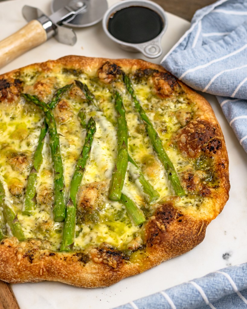 Talk about flavorful! Fresh, zesty pesto spread over a crisp pizza crust topped with gooey cheese and perfectly tender asparagus, finished with a drizzle of balsamic glaze. A quintessential spring pizza in the Worthington house. So delicious!