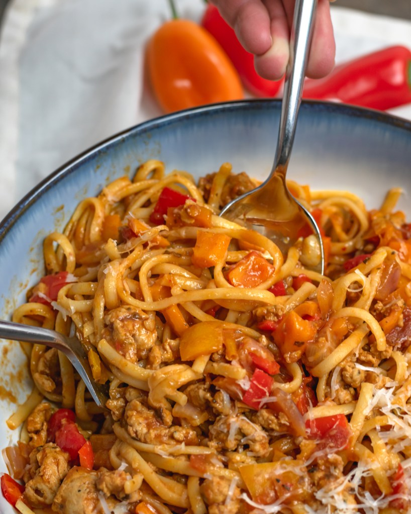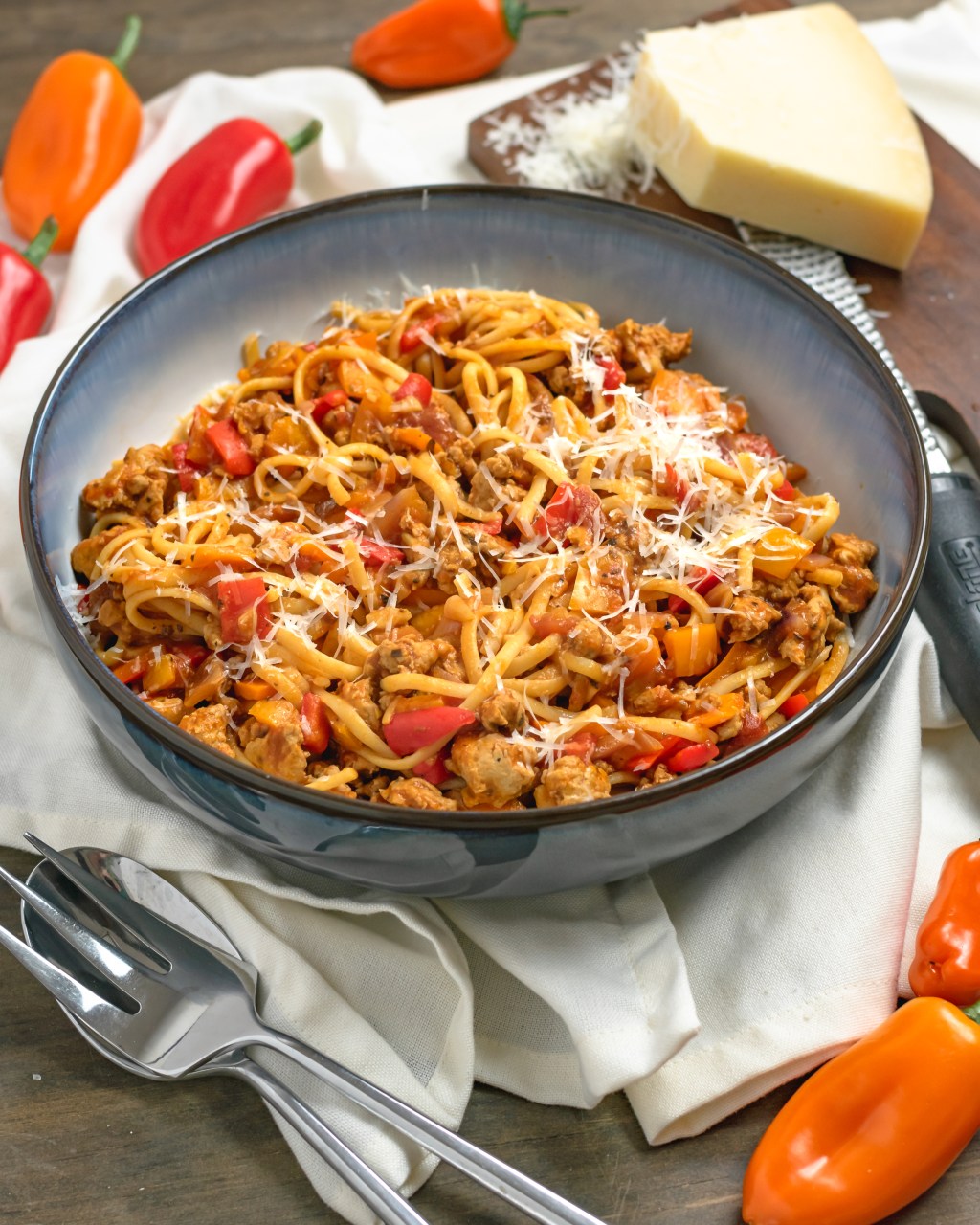 Mini sweet peppers and ground turkey sautéed with onion, garlic and lots of herbs, simmered in marinara then tossed in tender pasta. Fast, simple and full of flavor. A perfect weeknight meal.