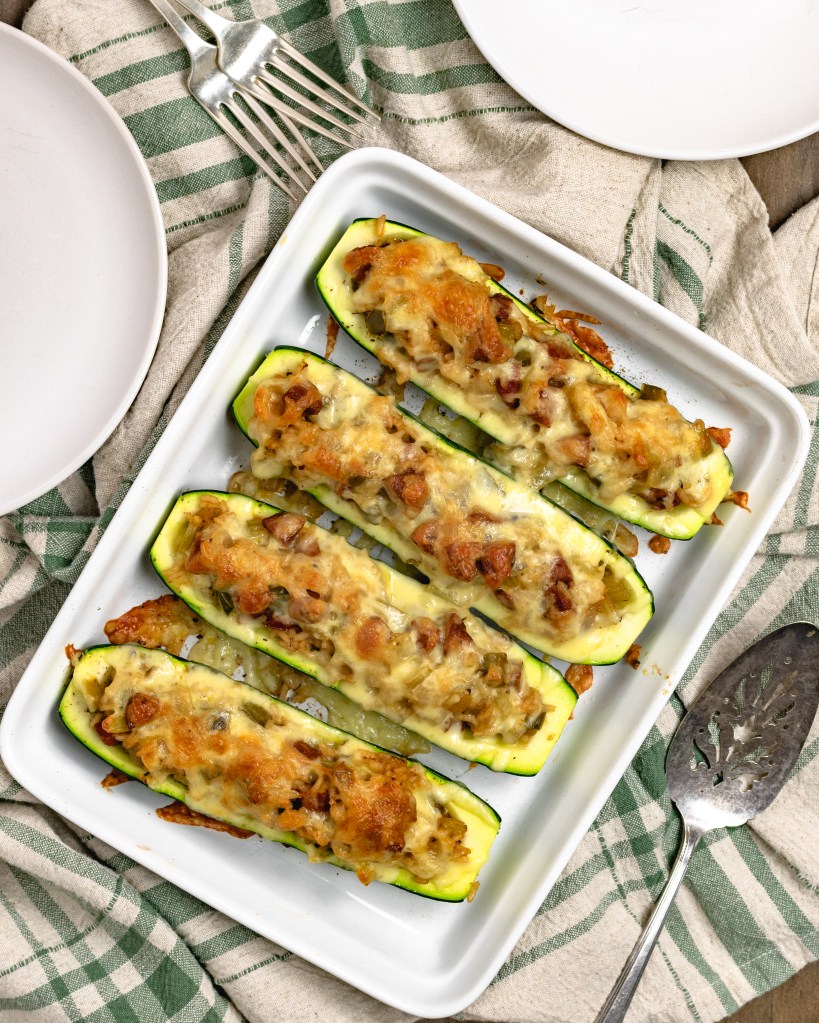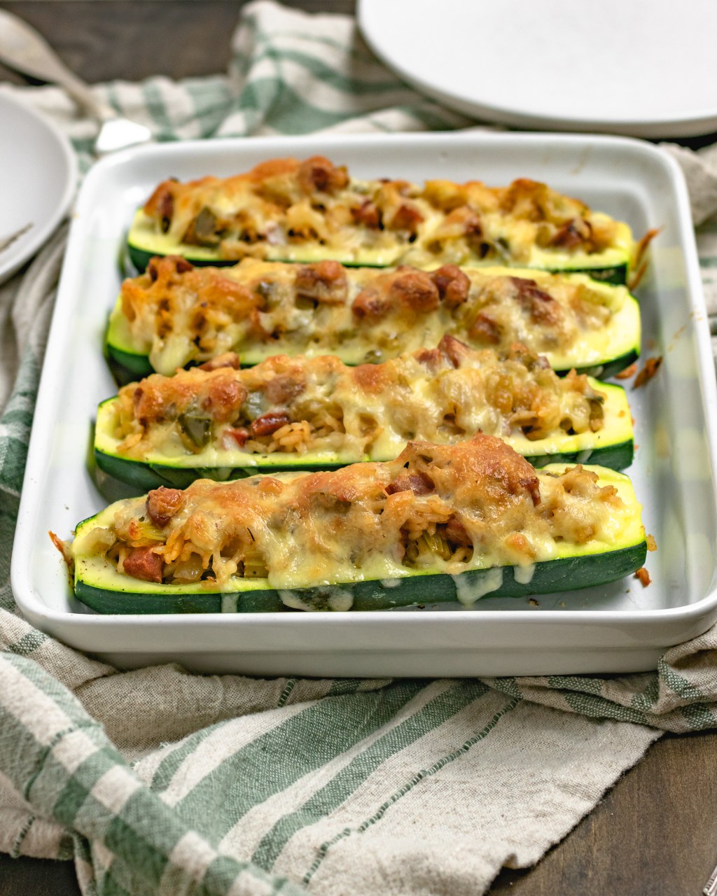 Andouille sausage sautéed with green bell pepper, celery, onion and lots of cajun spices, simmered together with rice and broth until the rice is tender, stuffed into hollowed out zucchini then topped with cheese and baked. Its spicy, fresh and so dang delicious!
