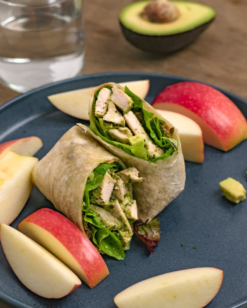 This quick and healthy lunch is about to be your new regular! Creamy, diced avocado, pesto coated chicken and fresh greens tossed in a little caesar dressing rolled up in your favorite wrap. So delicious and easy!