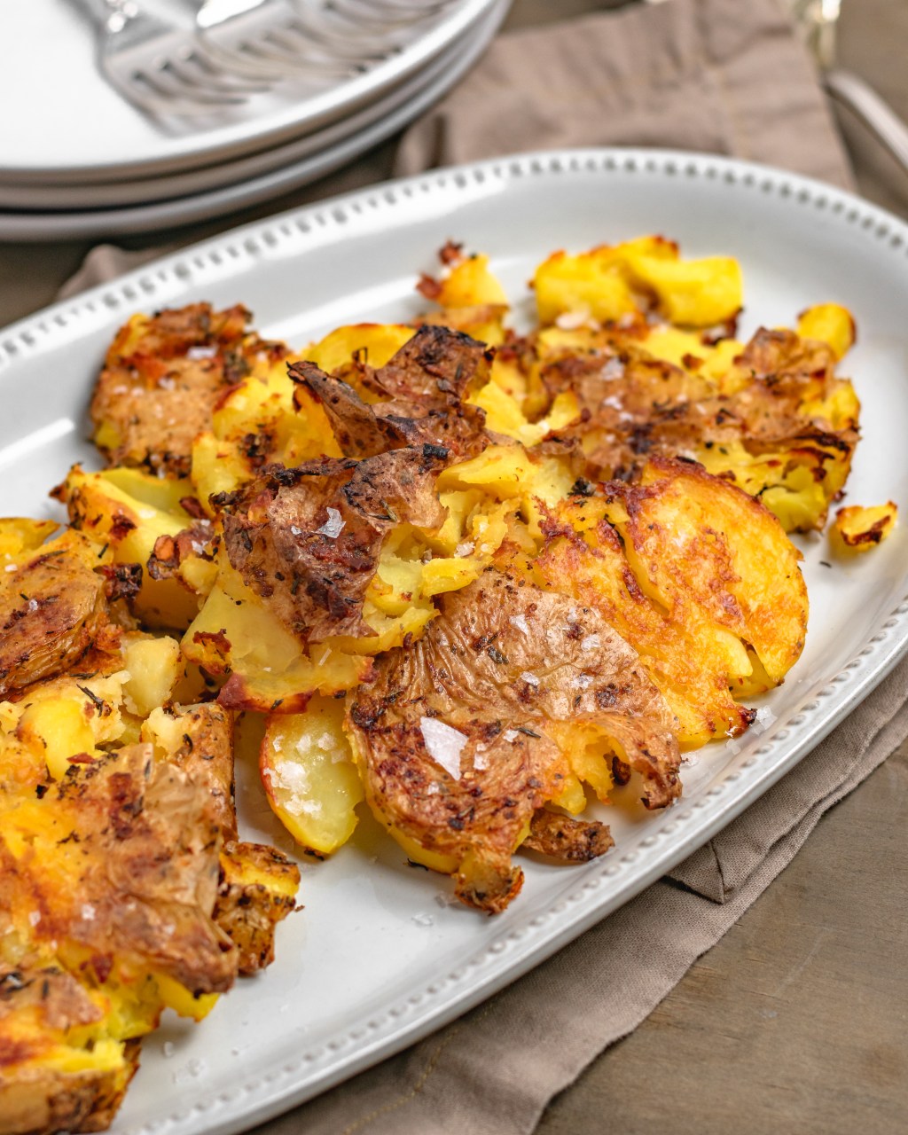 In a large bowl, stir together olive oil, garlic powder, thyme, paprika, oregano, salt, and pepper. Dump the potatoes in the bowl and toss to coat then pour them out on a large parchment-lined baking sheet. Using the bottom of a large cup, smash each potato down to at least 1/2″. Spread them out over the baking sheet then spoon any remaining spiced olive oil on top. Roast for 30-35 minutes, until the potatoes get nice and crispy.
