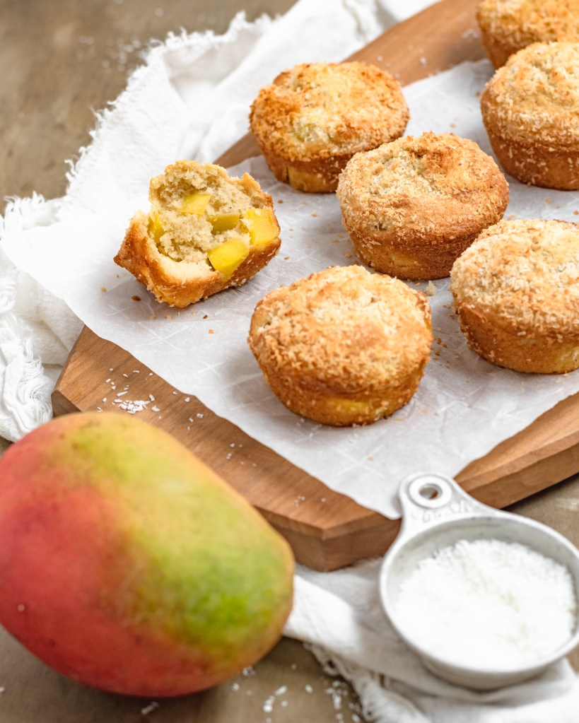 Fluffy, delicate coconut muffins with bits of mango and a touch of allspice to bring out those delicious tropical flavors. So flavorful with only just a touch of sweetness. A perfect little treat.