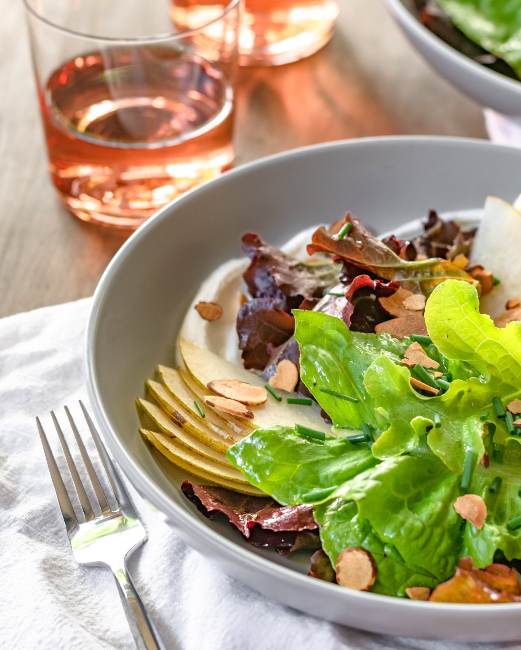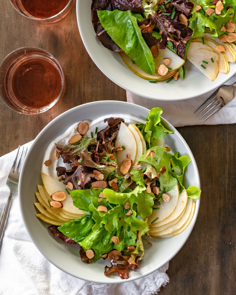 Fresh greens tossed in a light white balsamic vinaigrette over a smear of whipped ricotta, topped with thinly sliced pears and finished with chopped chives and toasted almonds. So perfectly balanced and flavorful.