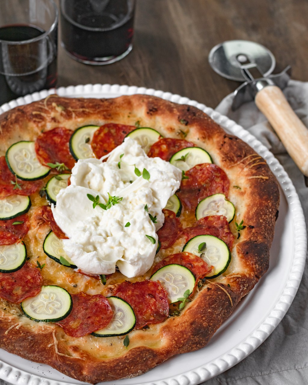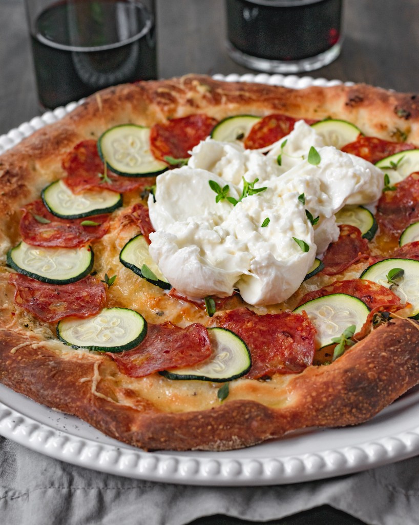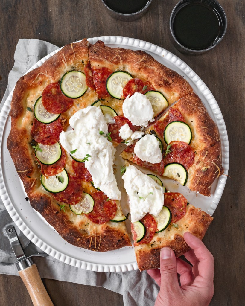 One of the best pizzas I’ve ever made! Thin sliced zucchini layered with hot soppressata over a garlic-thyme olive oil base with a sprinkling of parmesan. Baked until perfectly crisp then topped with some fresh burrata to finish it off. So freaking delicious. You are going to absolutely love this!