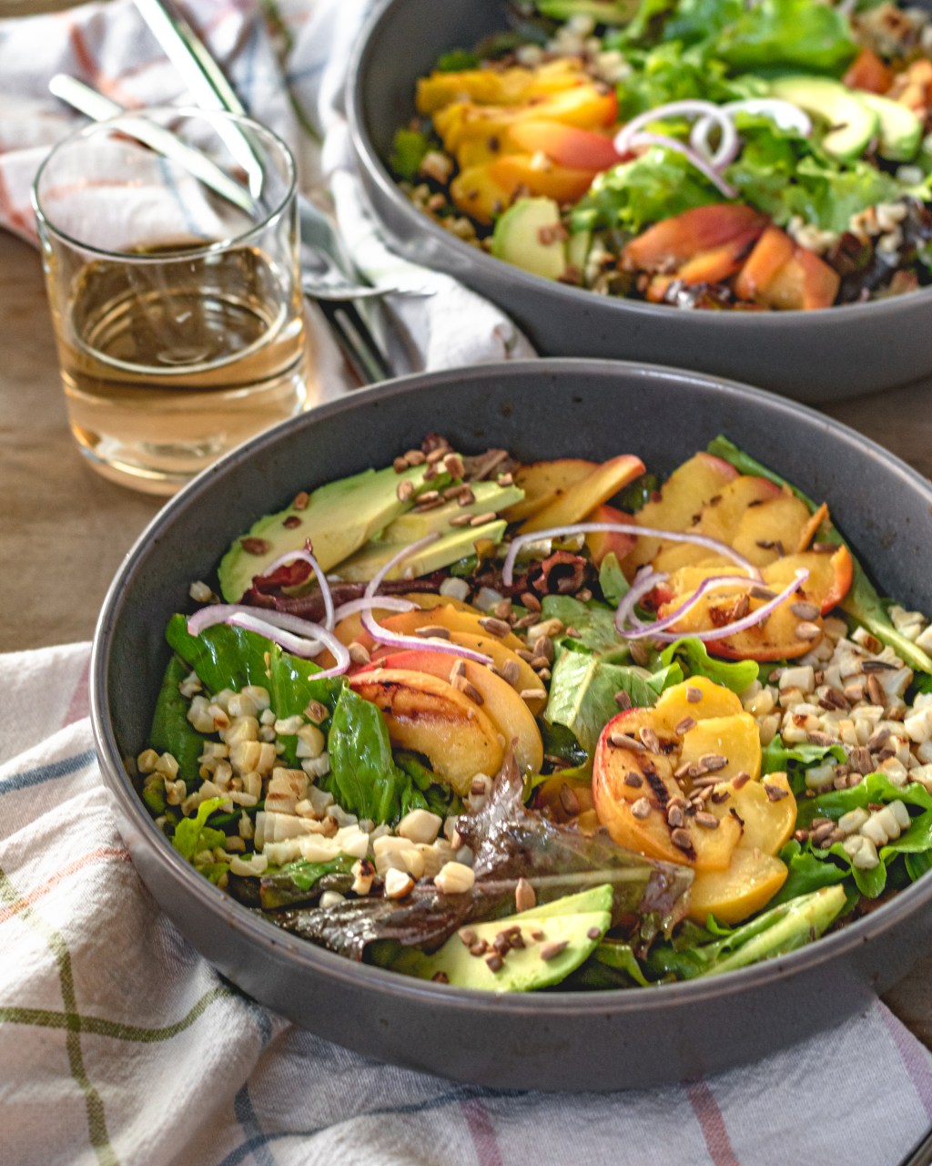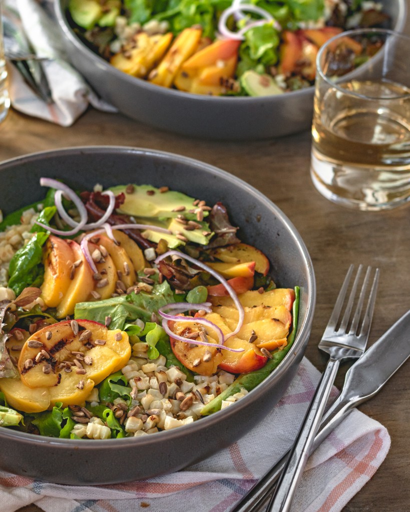 A perfect summer salad. Juicy grilled peaches and corn, creamy avocado, crunchy sunflower seeds and a touch of red onion for a little bite. So fresh and delicious.