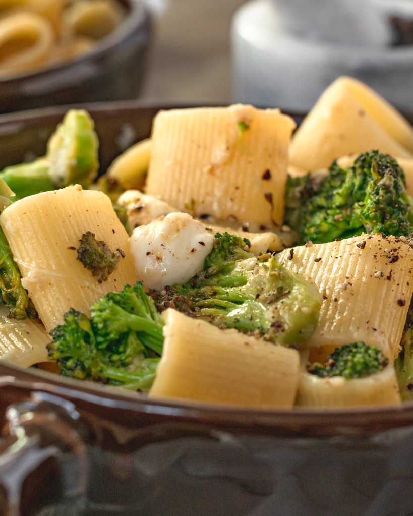Fresh broccoli florets sautéed in butter with lemon zest, lots of black pepper and garlic then finished with lemon juice and tossed with pasta and mini mozzarella balls. Such a quick, easy and delicious meal!