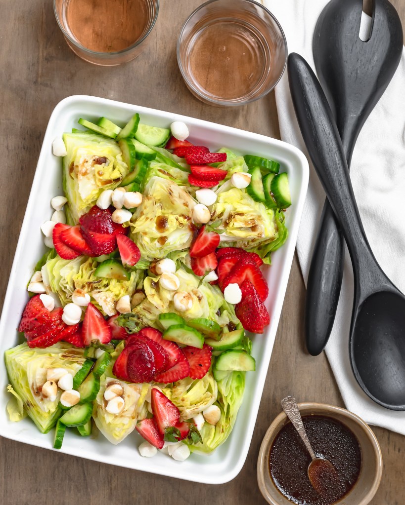 Fresh, delicious and super hydrating! Crisp iceberg lettuce with sliced strawberries, cool cucumbers and creamy mozzarella balls over the top with a drizzle of tangy-sweet balsamic dressing. Absolutely perfect for summer.