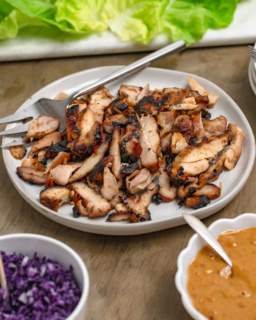 Chicken thighs marinated in a sweet ginger, garlic soy sauce. Grilled up until tender with a touch of char then chopped up and wrapped in a fresh lettuce leaf with a spicy peanut butter sauce. Such a delicious appetizer or light dinner. You’re gonna love it!