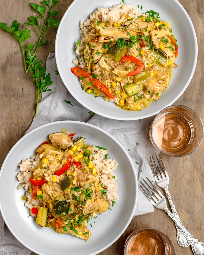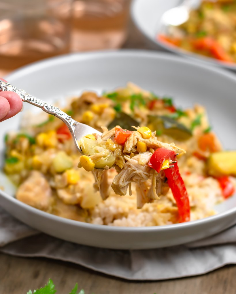 Chicken thighs spiced up then simmered in coconut milk with fresh corn, red bell pepper and zucchini. The most fall apart, tender chicken you’ll ever have. So freaking delicious and flavorful. You’re going to love it!
