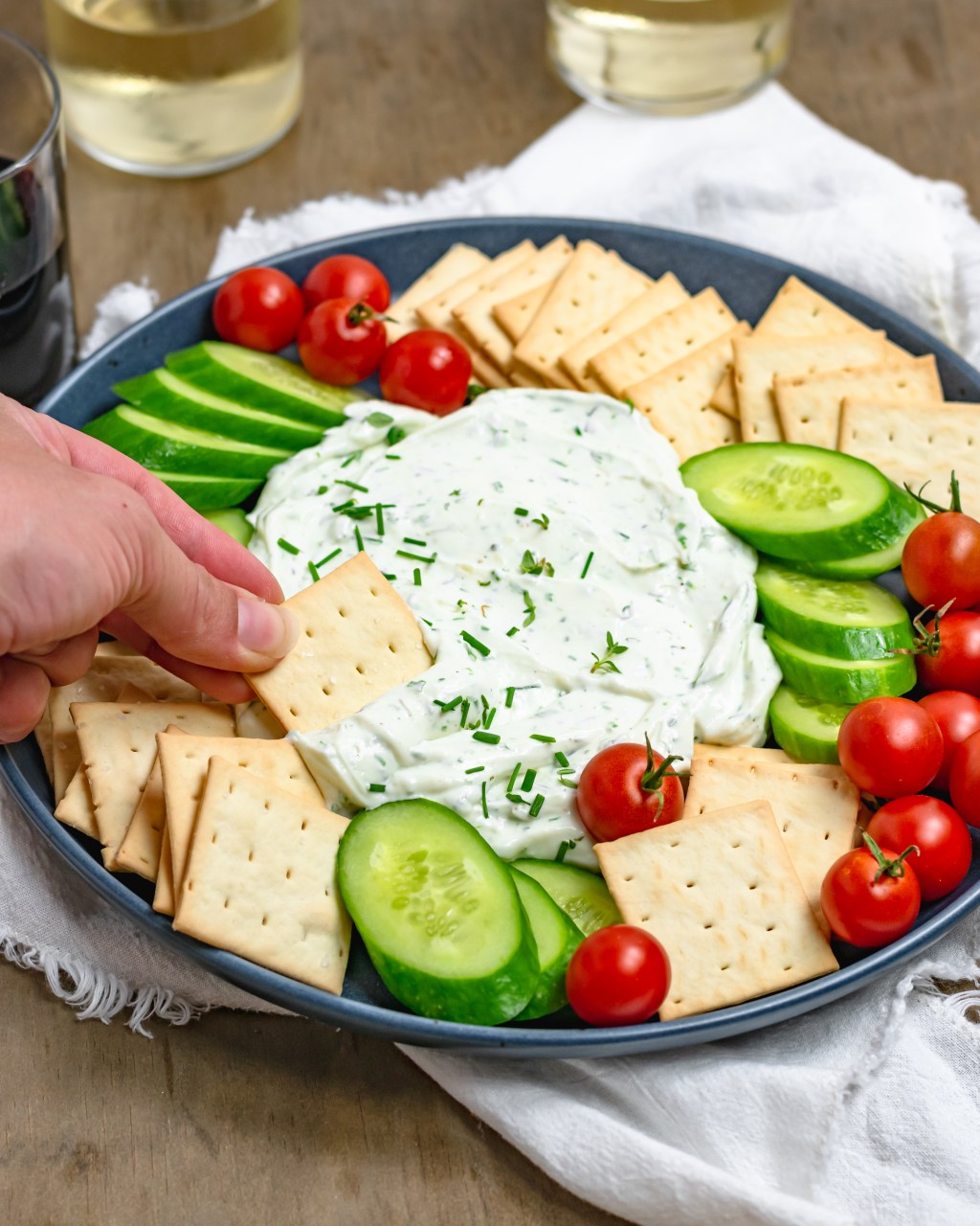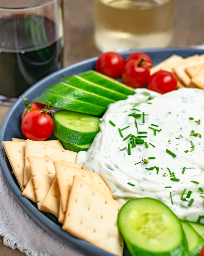 For dipping – crackers, cherry tomatoes, cucumber, peppers