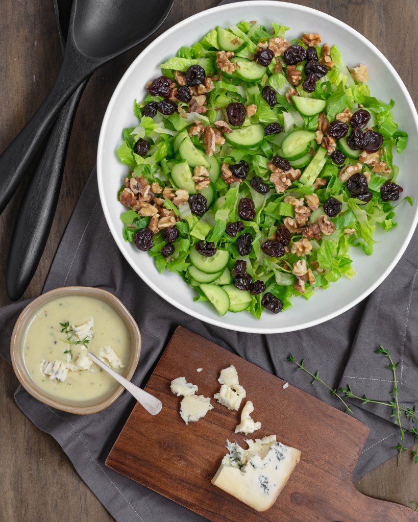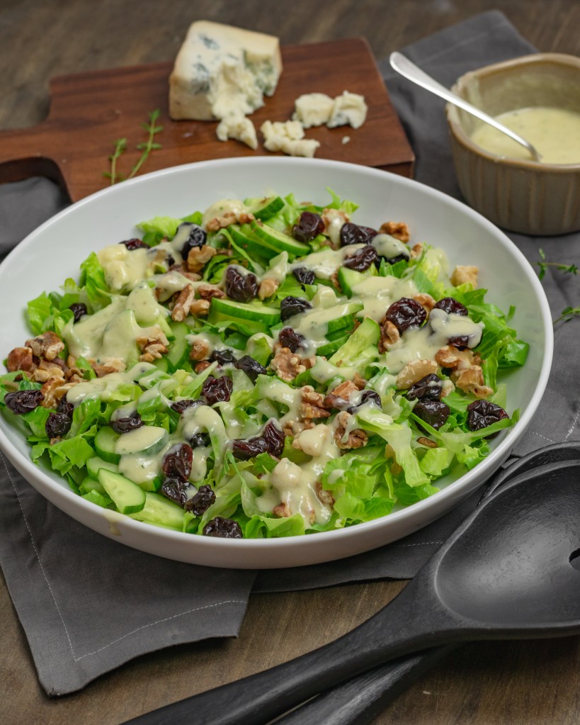 Tart, chewy dried cherries and crunchy, toasted walnuts over a crisp bed of romaine and cucumber slices, finished with a creamy, super flavorful gorgonzola-thyme vinaigrette. A delicious side salad for Fall!