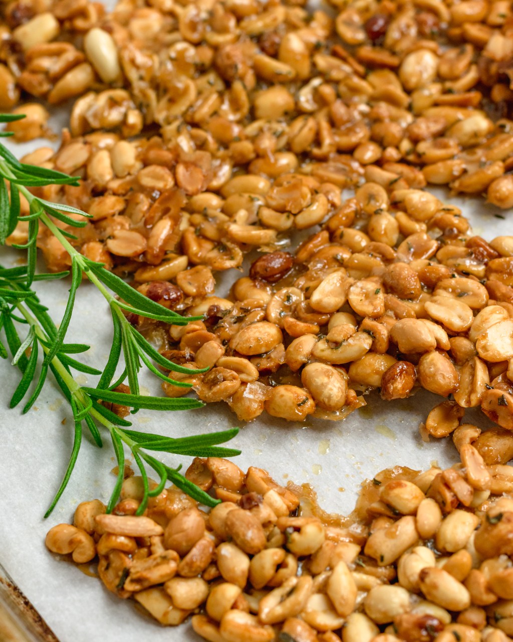 Peanuts roasted in a rosemary-infused maple butter with a touch of sea salt. As it cooks the maple butter turns into a rich and flavorful caramel that when cool becomes a crisp brittle that is so flavorful and deliciously perfect for Fall! You’re gonna love it!