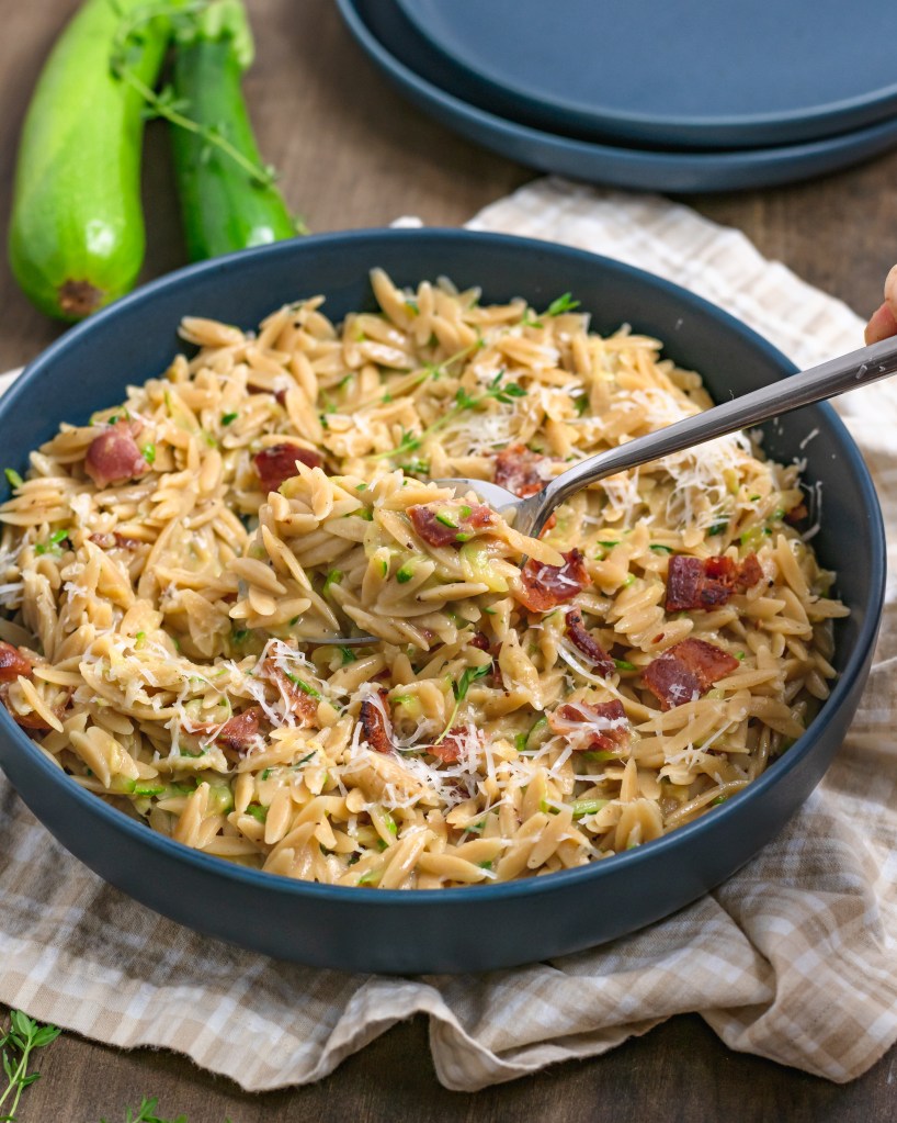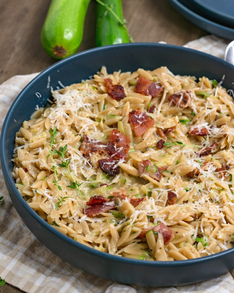 Garlicky-thyme shredded zucchini and orzo tossed in a ridiculously creamy parmesan egg sauce with crispy bacon. A delicious, easy and affordable dinner for 2.