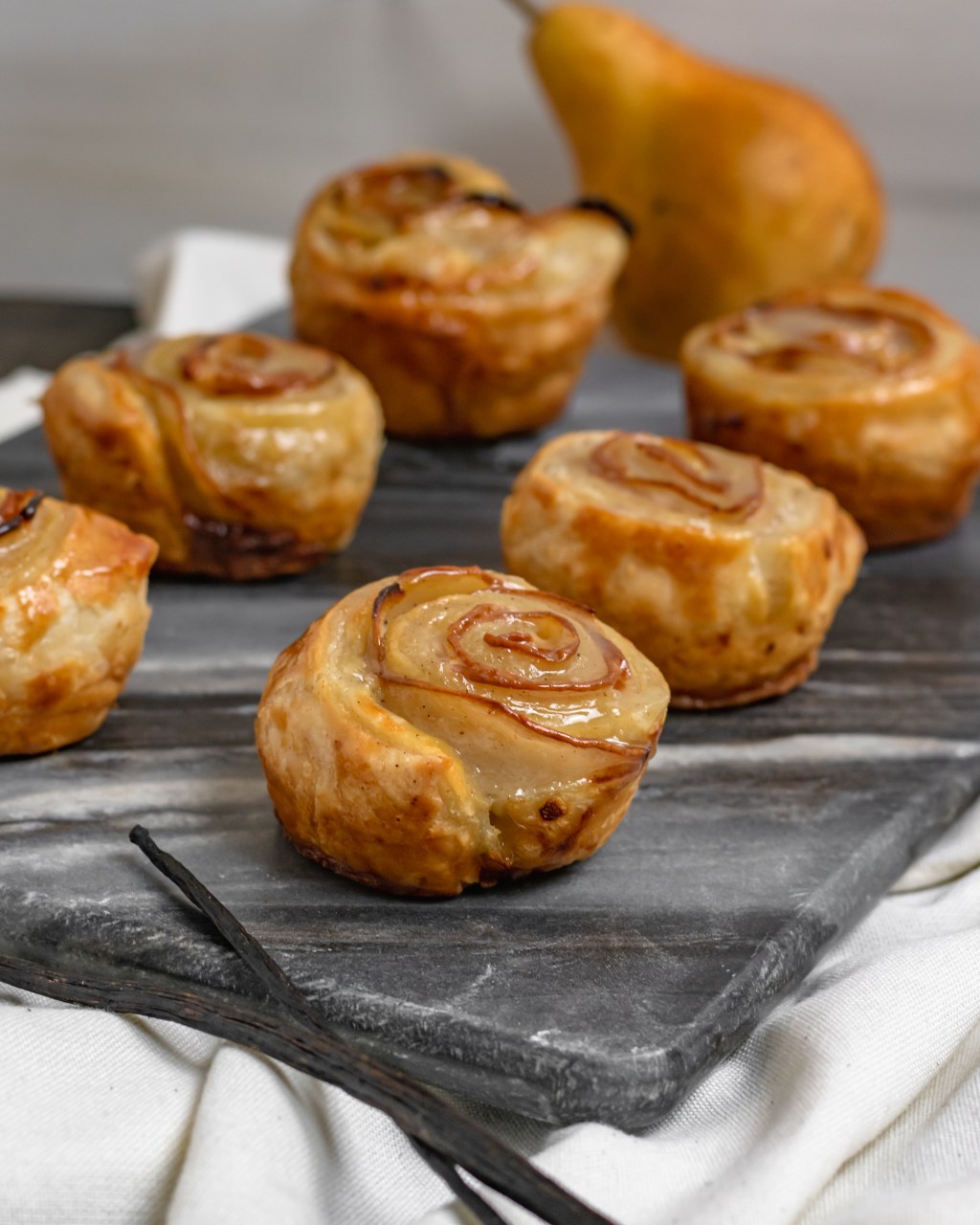 Crisp puff pastry rolled up with thinly sliced pear, finished with a vanilla glaze. Perfectly sophisticated and purely delicious. I can never make enough of these!